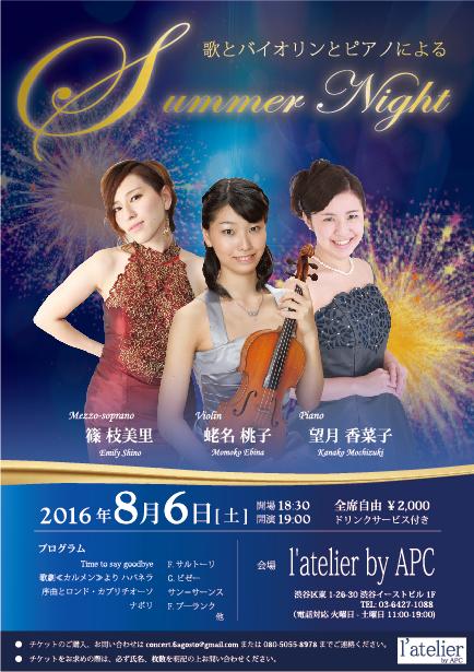大学、大学院生時代を共に過ごした、歌(篠 枝美里)、ヴァイオリン(蛯名 桃子)ピアノ(望月 香奈子)の3人で、情熱的なハバネラや、涼しげな小品など、夏にぴったりな名曲たちをお届けします。