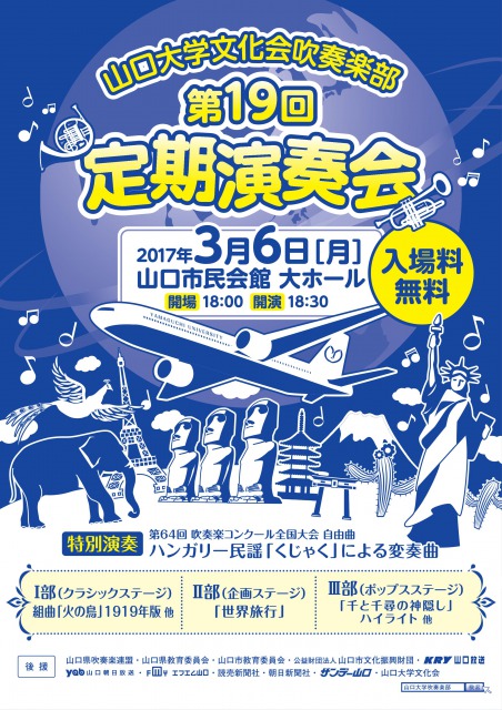 さて今回で19回目を迎える定期演奏会は、今年度の集大成のステージとなります。今回は今年度吹奏楽コンクール全国大会で演奏した自由曲、『ハンガリー民謡「くじゃく」による変奏曲』を特別に演奏させて頂きます。その他にもマーチング、ダンス、アンサンブルありの企画ステージや、どなたでも聞きなじみのある曲を演奏するポップスステージなど盛りだくさんの内容を用意しています。