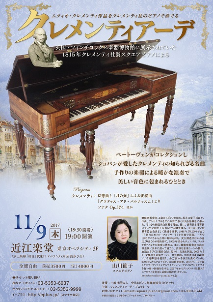 ソナチネで有名なクレメンティの知られざる名曲を彼自身が経営したクレメンティ社製の美しい楽器で演奏。当時の音色を再現します。イギリスの楽器博物館からやってきた貴重な楽器です。