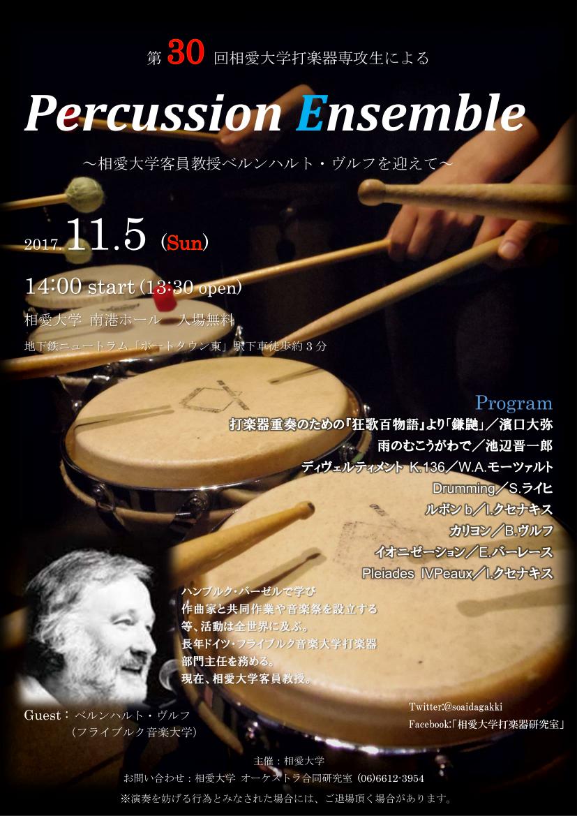今年で30回目を迎えることになりました相愛大学打楽器専攻生によるアンサンブルコンサート(アンサンブルの夕べ)ですが、打楽器アンサンブルの名曲の数々を沢山聴けるものになっています。打楽器に興味がある方、演奏している方はもちろん、打楽器を知らない方でも新しい体験ができるコンサートになるように演奏会にも工夫を凝らそうと企画中です!
