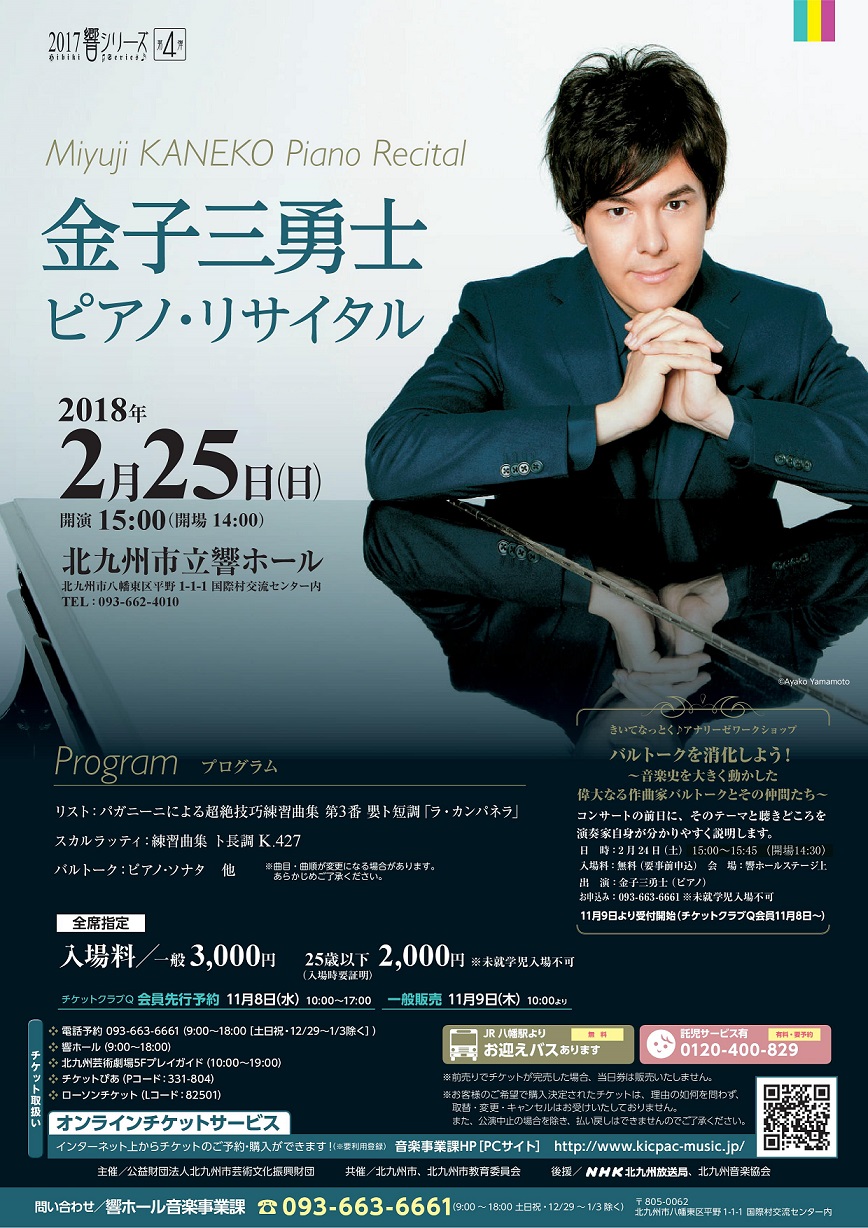 昨年に引き続き、金子三勇士が響ホールレジテント・アーティストとして、演奏とトークを交えたピアノ・リサイタルを開催します。国内外で活躍する若手新進ピアニストによる大胆かつ繊細な演奏をご堪能ください。