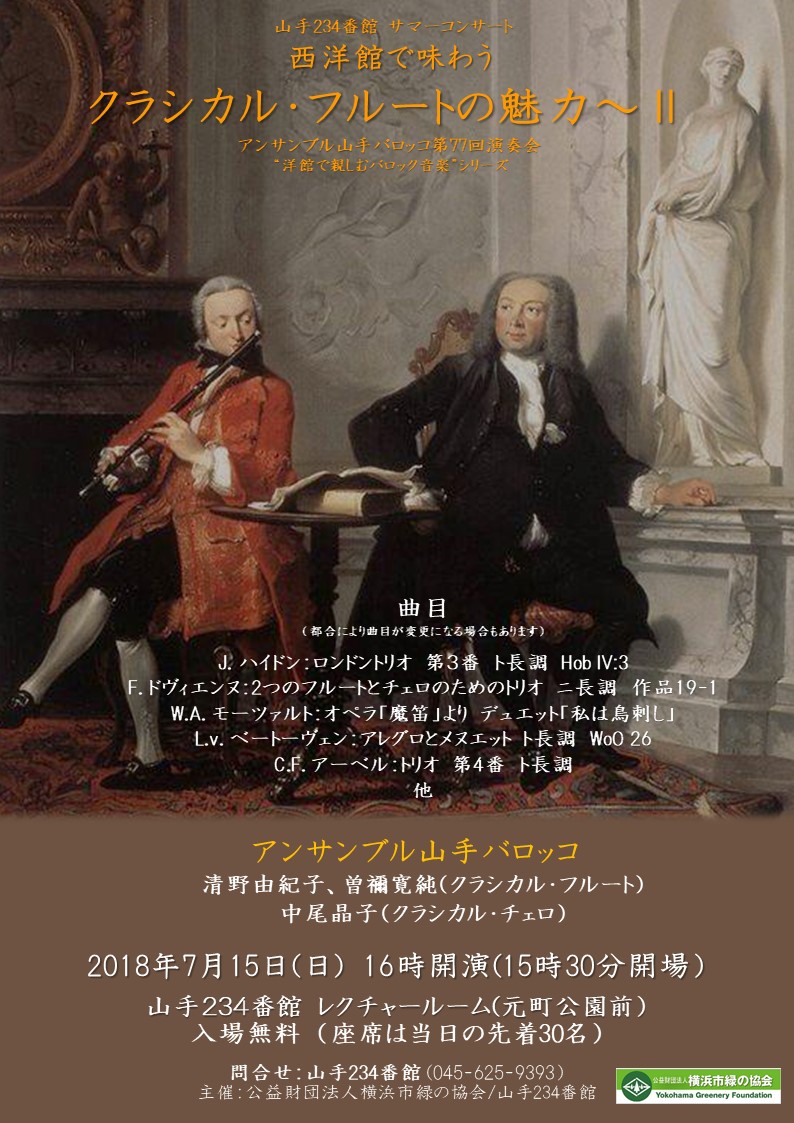 昨年のサマーコンサートで好評をいただきました「西洋館で味わうクラシカル・フルートの魅力」の続編として、西洋館の親密な空間で、古典派の時代に使われた多鍵フルート(クラシカル・フルート)とクラシカル・チェロによるアンサンブルを楽しみます。今回も例年より少し時代を下り、ハイドンやモーツァルトの時代の家庭音楽、サロン音楽を、234番館の音の満ち溢れる空間をお届けします。どうぞお越しください。