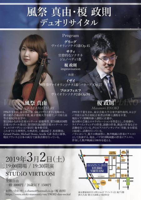 東京藝術大学を経て、パリ国立高等音楽院に在学中の風祭真由(ヴァイオリン)と榎政則(ピアノ)によるデュオとそれぞれのソロ、さらにピアノ即興科修士課程に在籍している榎による即興演奏もお楽しみ頂けます。