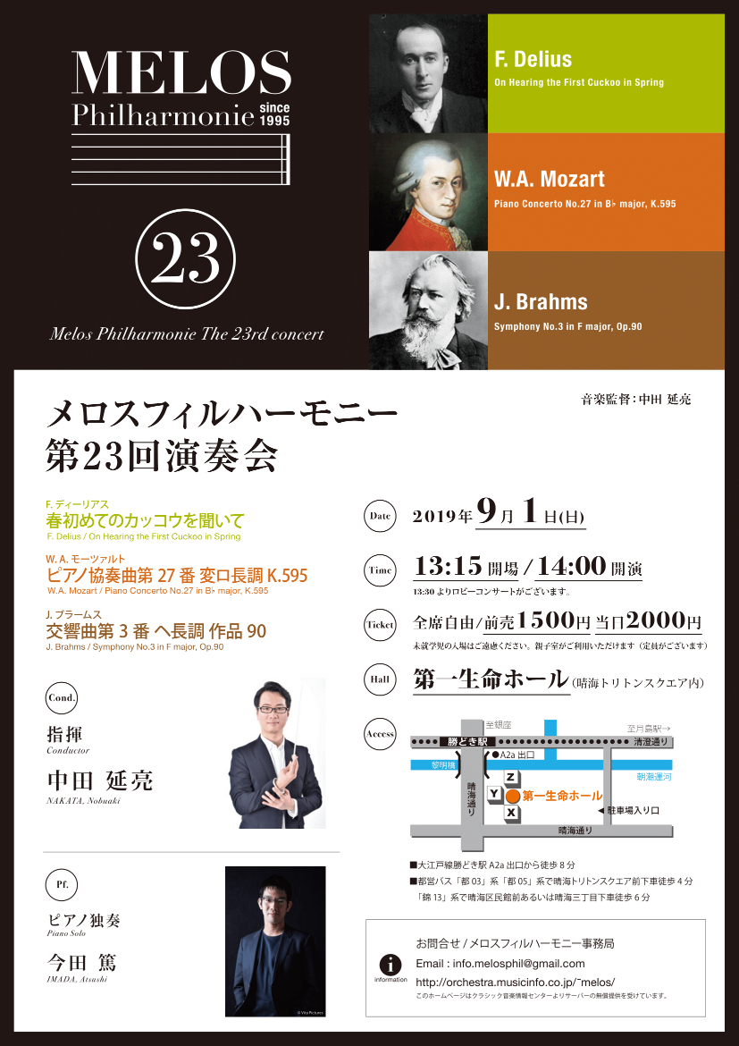 今シーズンのメロスフィルは色彩豊かな風景を思わせるディーリアスの 春初めてのカッコウを聞いて にはじまり、注目の若手ピアニスト今田篤氏をむかえ、モーツァルトの最後のピアノ協奏曲にして多くの人に愛される第27番、さらにブラームスの至高の名曲交響曲第3番を渾身の力と想いをこめて演奏いたします。