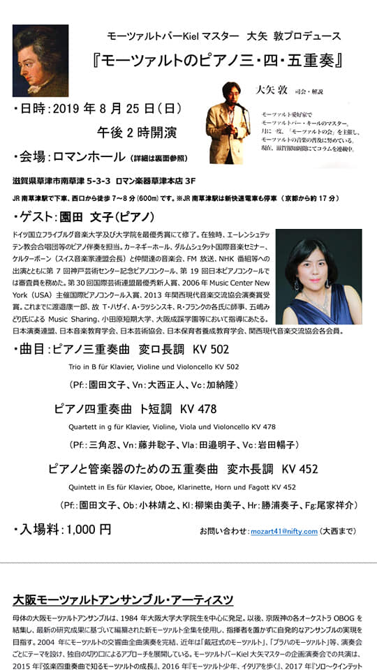 浜大津にあるモーツアルトバーKielのマスター大矢氏が企画する、モーツァルトのお話と室内楽の気軽なコンサートの第5弾です。今回はピアニストの園田文子さんをお迎えし、大阪モーツァルトアンサンブル・アーティスツとトリオ・カルテット・クインテッドをお届けします。