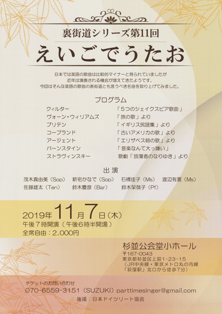 裏街道シリーズも昨年10回の節目を迎えました。第11回となる今回、気持ちを新たに面白いコンサートを目指してまいります。