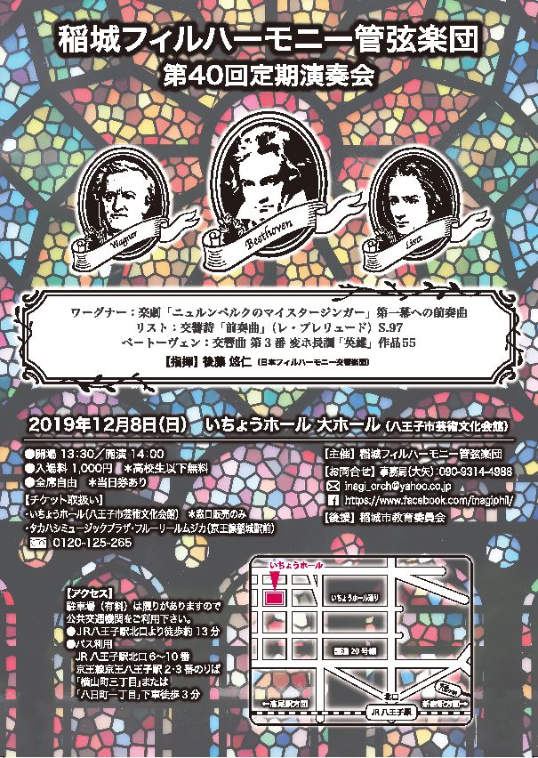 第40回定期演奏会では、稲城フィルでは久しぶりのベートーヴェンの交響曲をとりあげます。ベートーヴェンの交響曲 第3番 変ホ長調「英雄」は、曲者自身が、自作で一番の出来であると認めたといわれています。マエストロ 後藤 悠仁氏のもと、この傑作を稲城フィルはどのように演奏しますでしょうか。どうぞご期待ください。他に、ワーグナーの楽劇「ニュルンベルクのマイスタージンガー」第一幕への前奏曲、リストの交響詩「前奏曲」(レ・プレリュード)もお楽しみください。