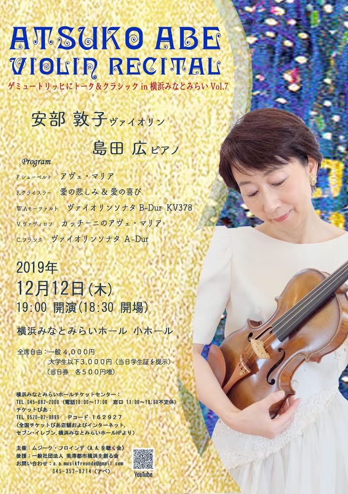 クラシック音楽を演奏家と共に楽しみ、満たされた幸せな感覚を味わってほしい、素敵なひと時を共有したい。敦子さんのそんな想いから1994年に始まった「ゲミュートリッヒにトーク&クラシック」シリーズ。ムジーク・フロインデでは、これまで20回のコンサートを開催して参りました。今回は、名曲フランクのソナタをメインにオーストリアとの友好150周年にちなみ、クライスラーの小品やモーツァルトのソナタ、そしてクリスマスに合わせてアヴェ・マリアなどをちりばめた珠玉のプログラムとなっています。