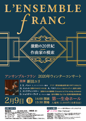 今回、アンサンブル・フランが新田ユリ先生の指揮と共に演奏するのは、激動の20世紀を生きた作曲家・編曲者たちの5作品です。