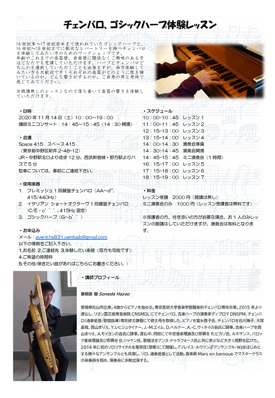 公式情報チェンバロ、ゴシックハープ体験レッスン&ミニ演奏会