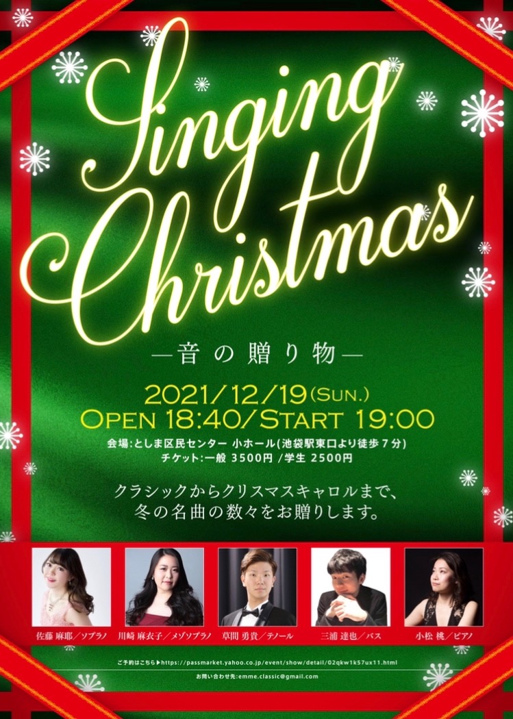 キャロルやクリスマスの名曲に加え、それぞれ得意なオペラや歌曲も披露し、盛り沢山なプログラムをお届けいたします。