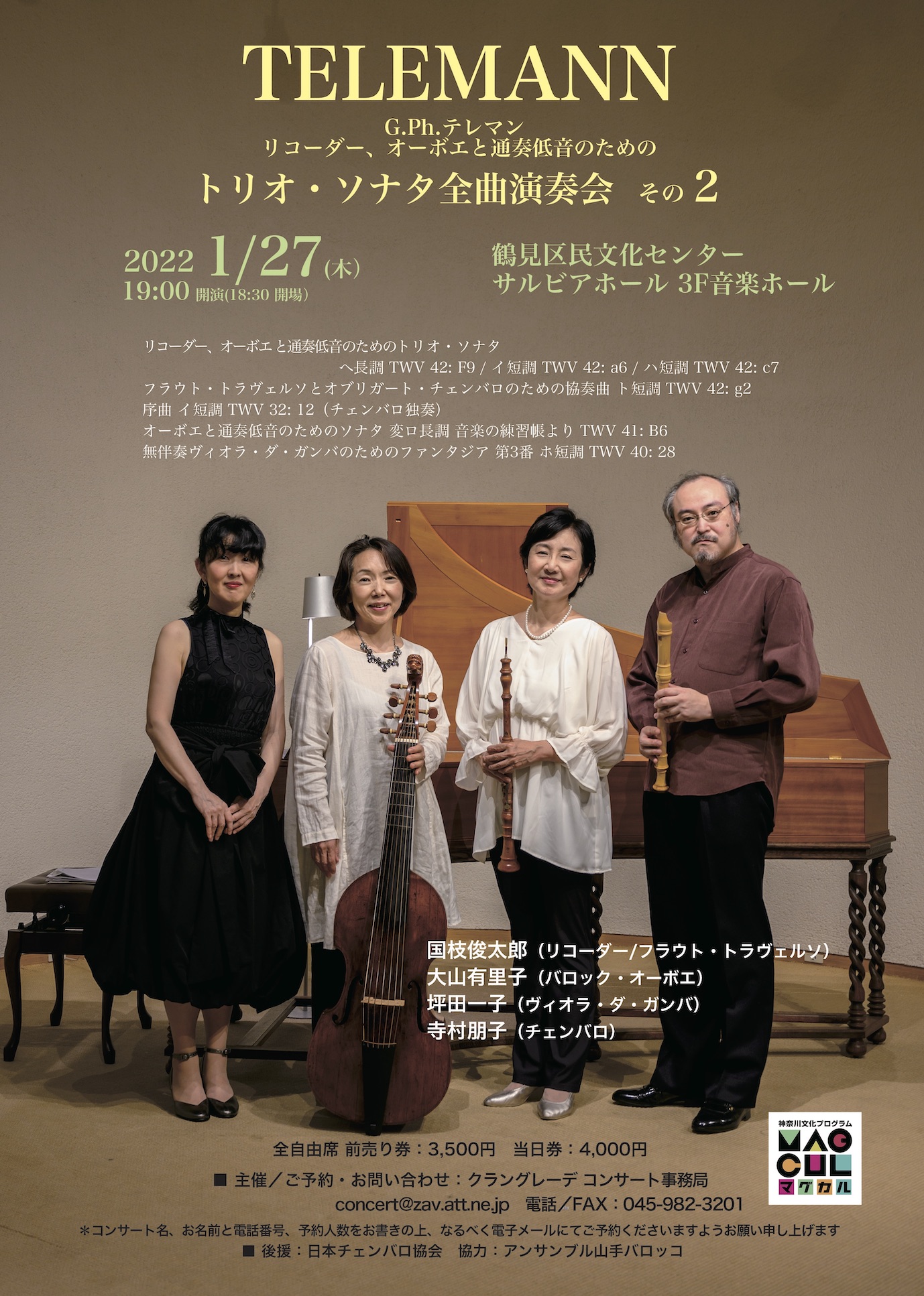 テレマンの作品のうち「リコーダー、オーボエと通奏低音のためのトリオ・ソナタ」は現在6曲が残されています。昨年のコンサート「その1」ではそのうち半分の3曲を取り上げ、テレマンの楽しさを満喫した、とご好評をいただきました。今回のコンサートでは残りの3曲と、その他の作品を演奏いたします。テレマンが精魂を傾けた室内アンサンブルの世界をお楽しみください。