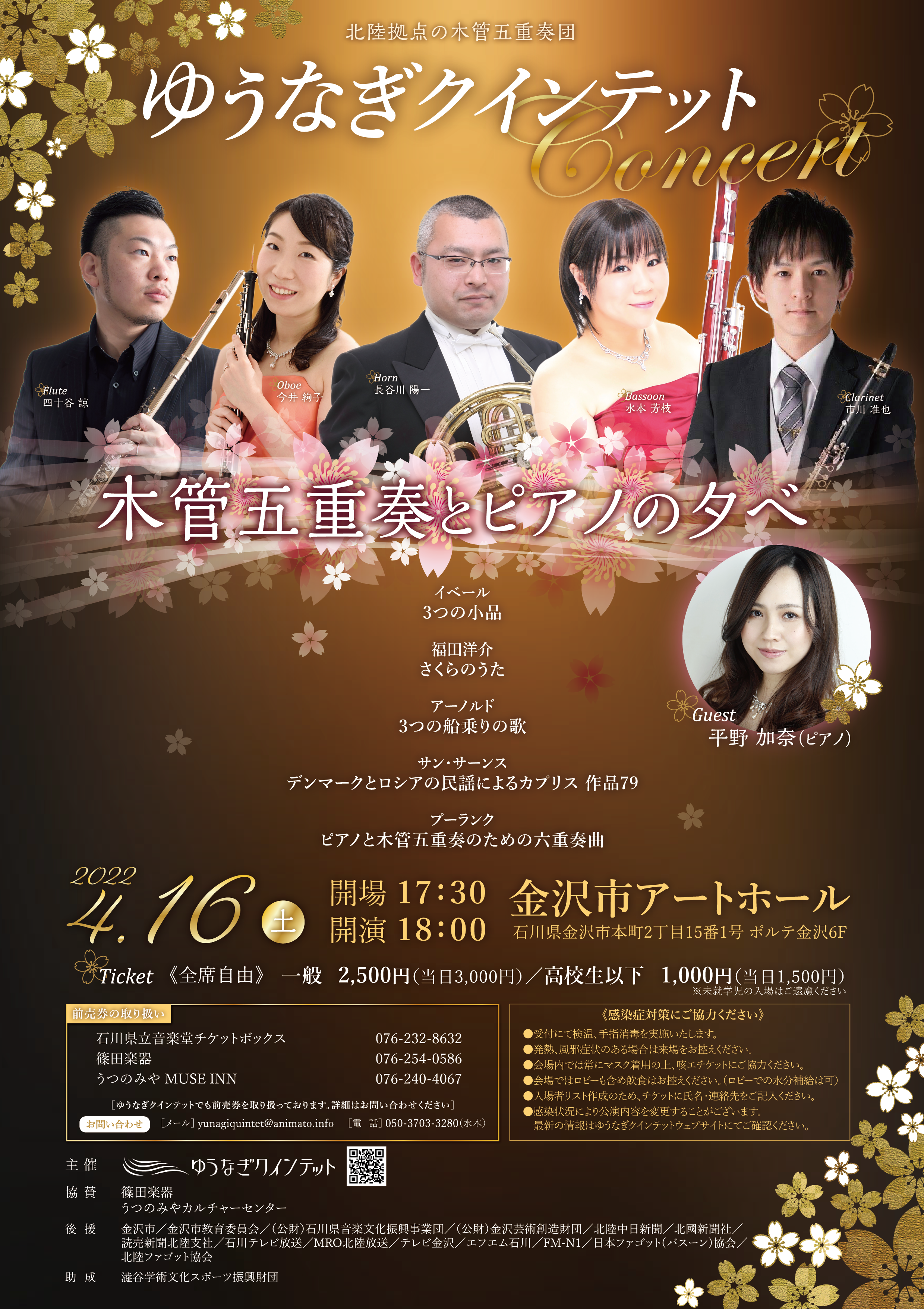 北陸では唯一のプロ奏者による常設木管五重奏団、「ゆうなぎクインテット」主催公演。
