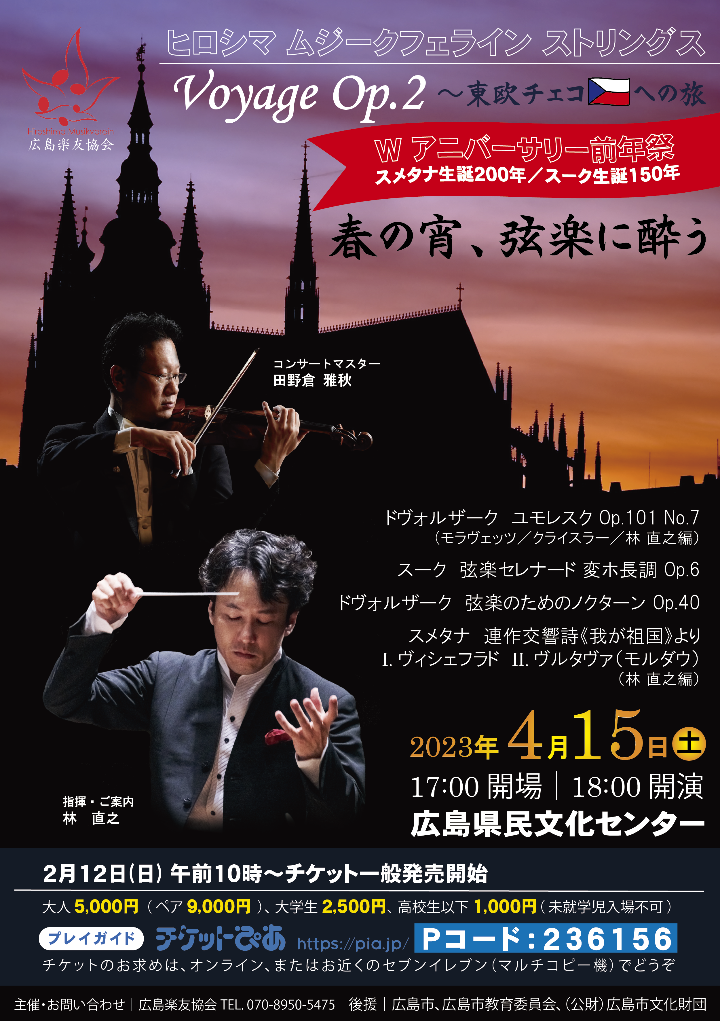 1年先取りの前年祭として、スメタナ不朽の名作《我が祖国》より”ヴィシェフラド(高い城)”と”ヴルタヴァ(モルダウ)”を、主宰・指揮者の林直之みずからのオリジナル編曲による弦楽合奏版で、またあまり上演機会の多くないスークの弦楽セレナーデを取り上げる。そのほか、ドヴォルザークの珍しい名品も。