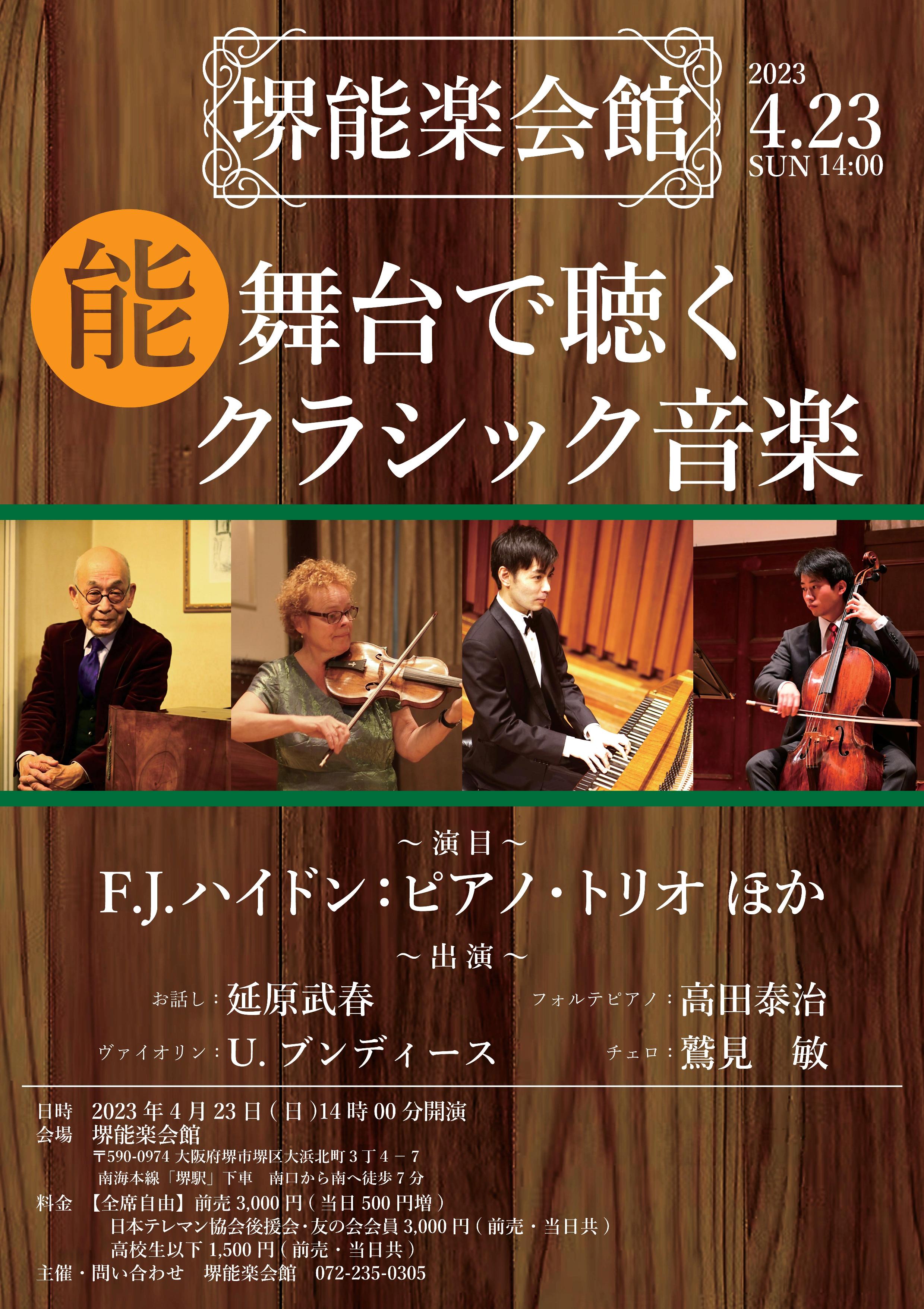 能舞台で聴くクラシック音楽シリーズが約3年ぶりに再開します。再開を記念して特別ゲストにヴァイオリニストのU.ブンディースがドイツより来日、延原武春が率いるテレマン室内オーケストラのメンバーと能舞台で共演します。クラシカル楽器による演奏でモーツァルトやハイドンの新鮮な響きをお楽しみください。