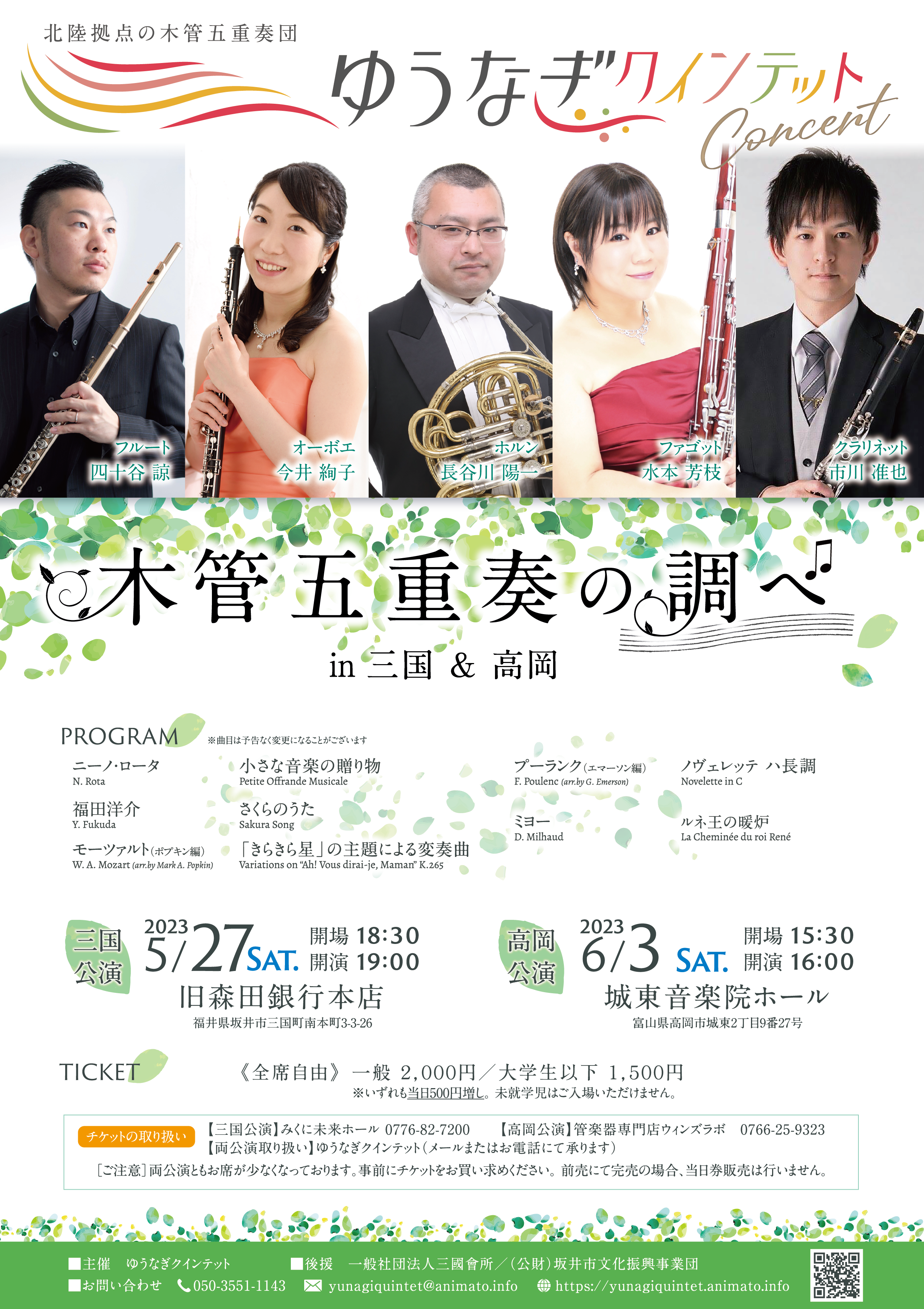 北陸を拠点に活動するプロ木管五重奏団、ゆうなぎクインテットによる演奏会。