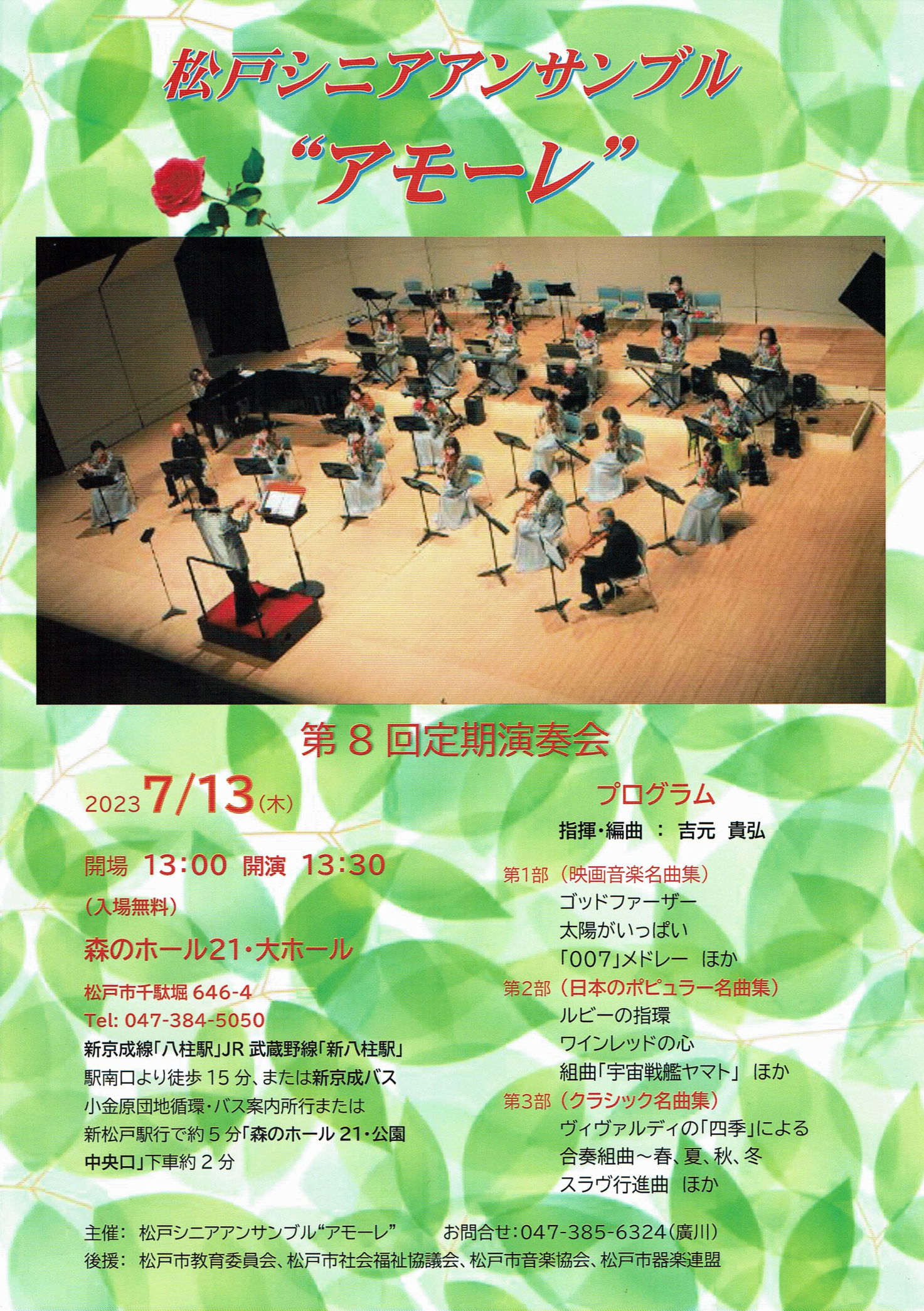 シニア中心のアンサンブル楽団ですが、吉元貴弘先生(常任指揮者)の厳しくも、ユーモアに富んだご指導の下、練習を重ねてきました。