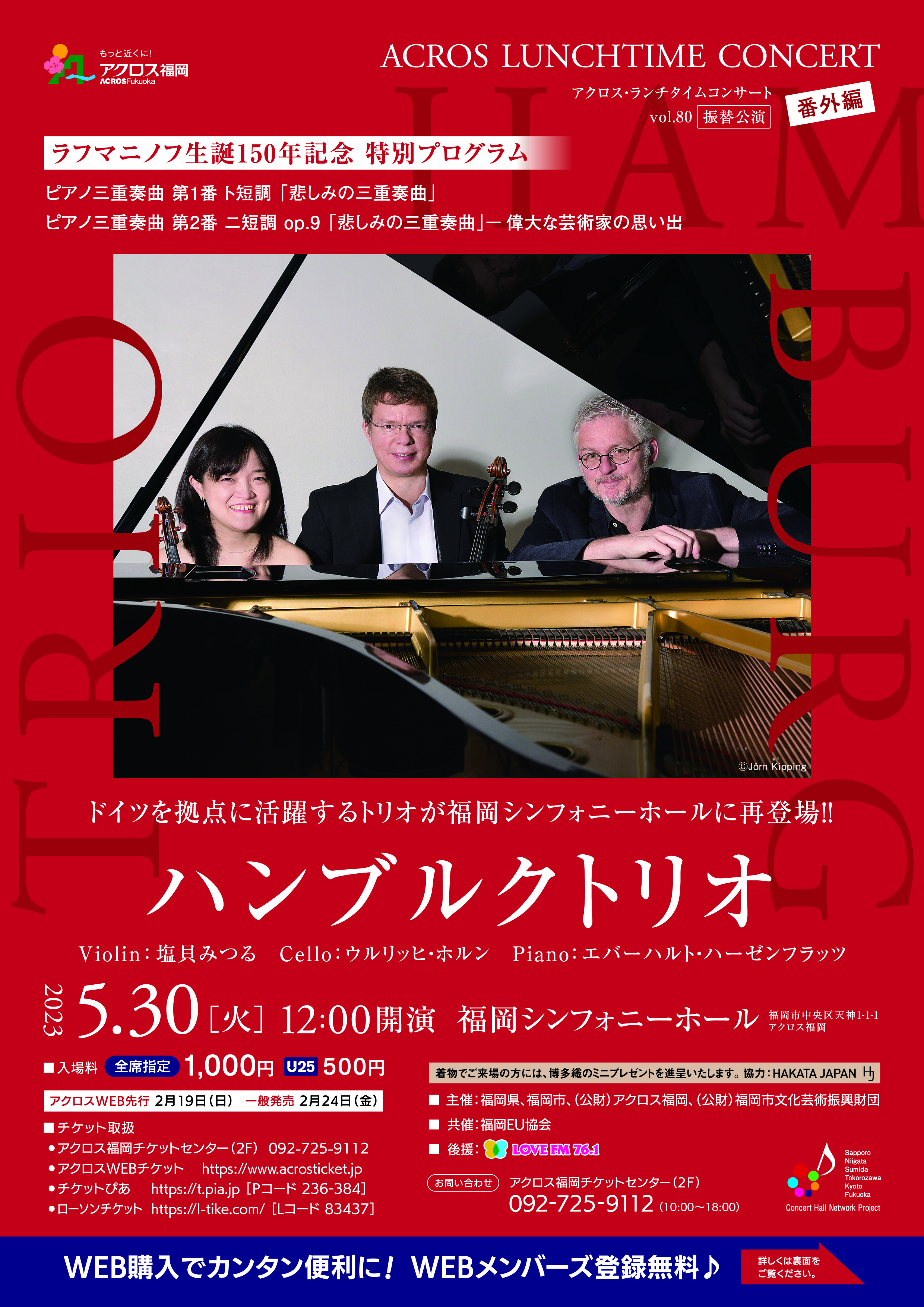 2023年5月30日(火) 12:00~アクロス福岡シンフォニーホールにてアクロス・ランチタイムコンサートvol.80振替公演《番外編》『ハンブルクトリオ』が開催されます。