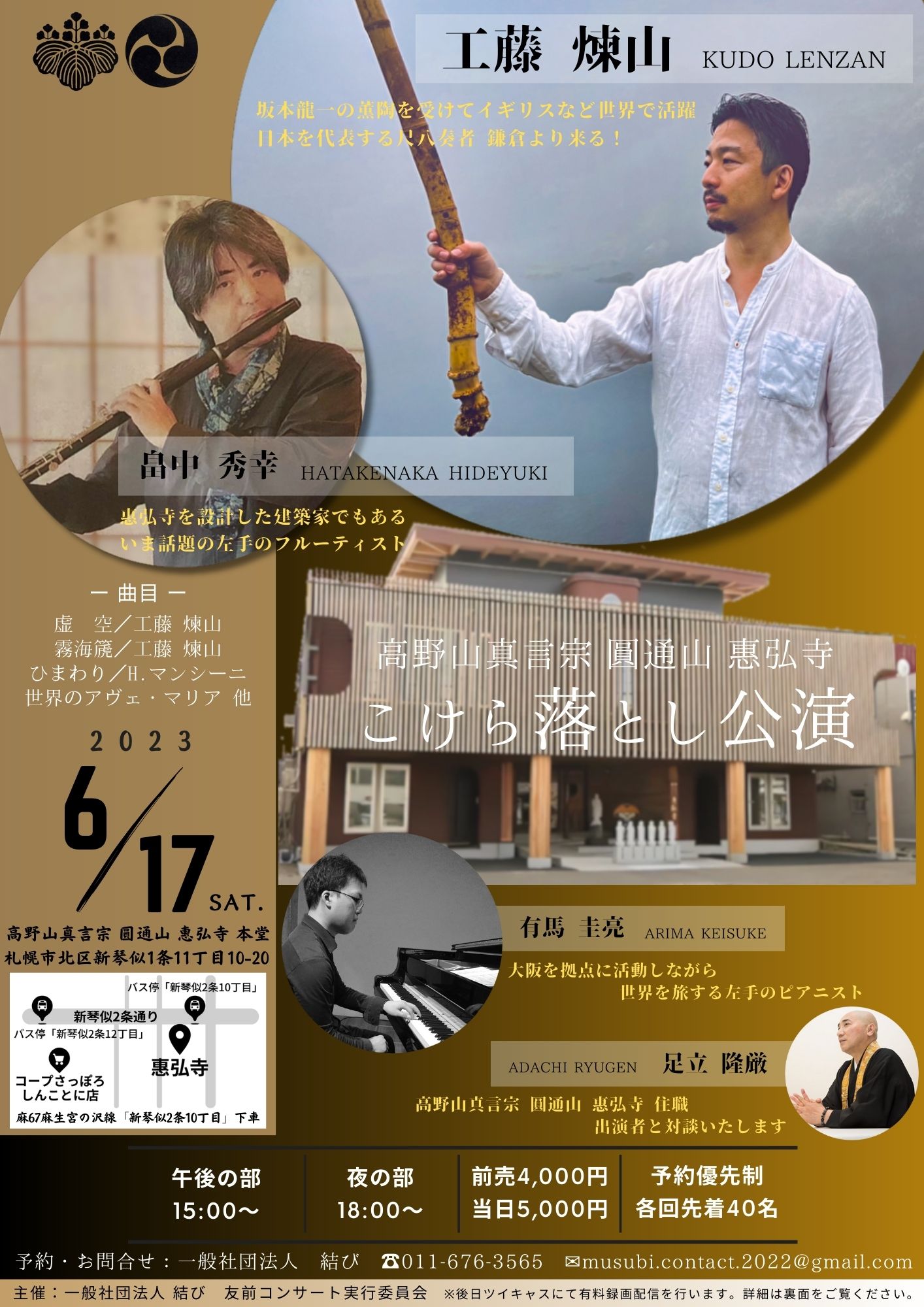 またこの寺の設計者でもあり、いま話題の左手のフルーティストである畠中秀幸と、大阪在住の左手のピアニスト有馬圭亮が出演します。