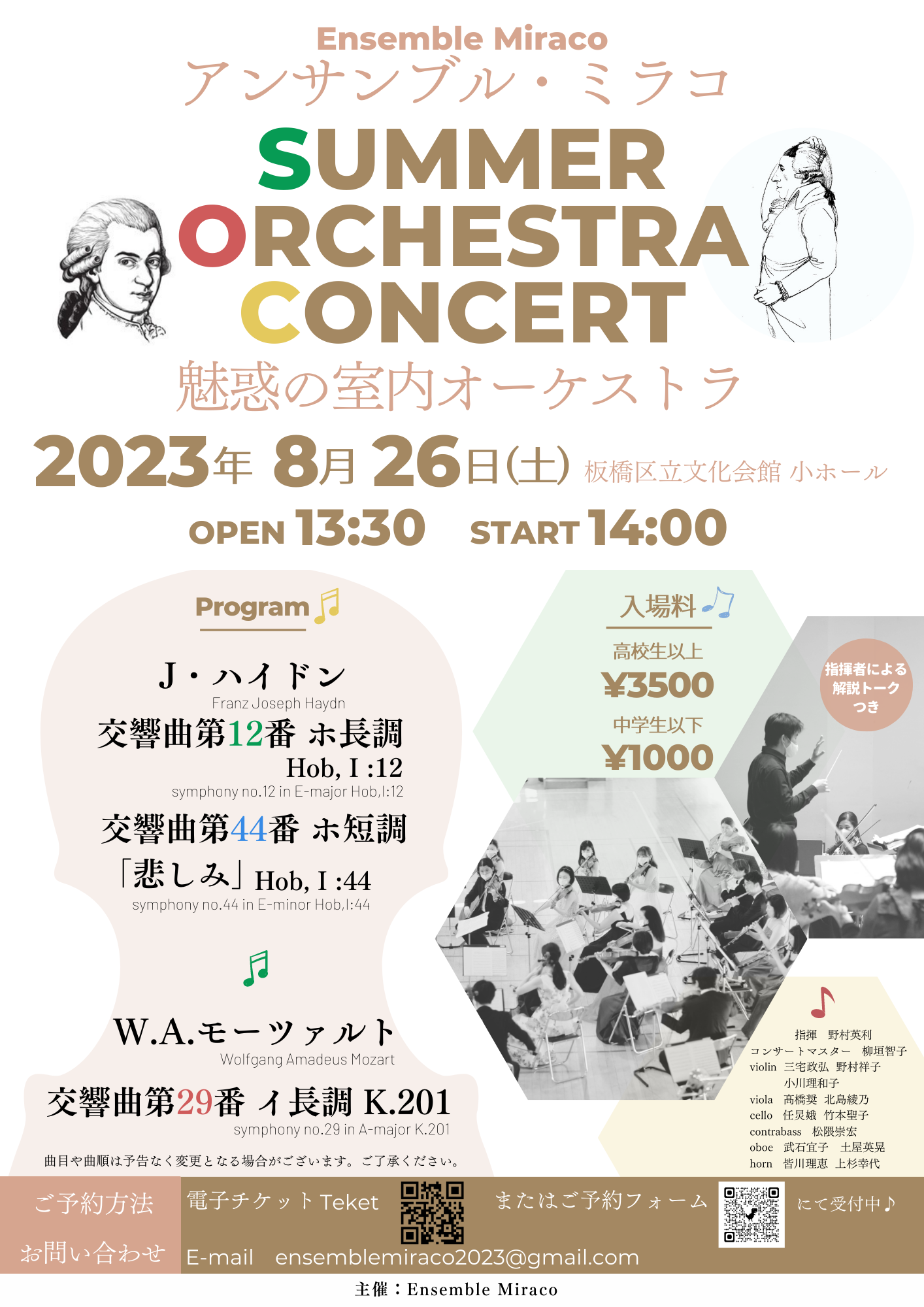 長らくザルツブルクを拠点に活動してきた指揮の野村英利氏と、ソロやオケで活躍する演奏家たちによる室内アンサンブルをぜひお楽しみください。