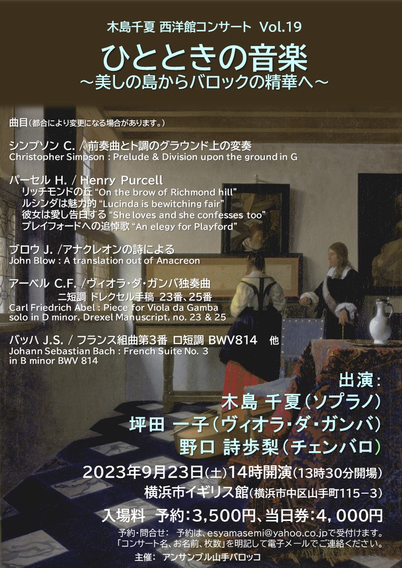 今年の木島千夏さん西洋館コンサートも、イギリス館の素晴らしい客間の雰囲気の中でお楽しみいただきます。19回目のコンサートを準備くださった古楽分野で活躍のソプラノ木島千夏さん。共演は、ヴィオラ・ダ・ガンバ奏者の坪田一子さん、チェンバロ奏者の野口詩歩梨さん。お互いに何度も共演の経験のある3人による親密なサロンコンサート。コンサートは前半で、美しの島イギリスの隠れた名曲を味わい、後半にはバッハをはじめとする盛期バロックの曲をお聴きいただきます。よろしくお願いします。