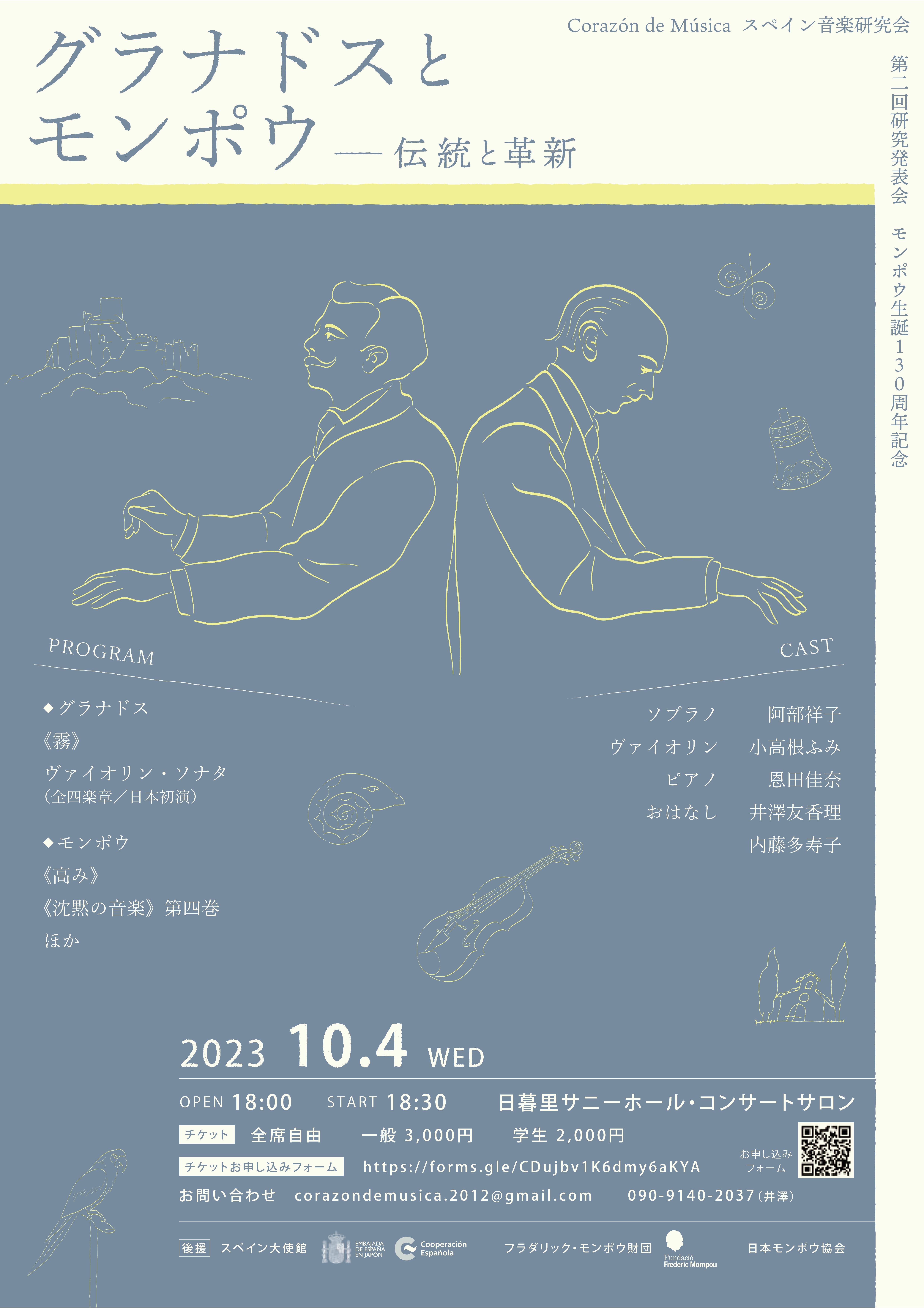 19世紀後半から20世紀スペインを代表する作曲家アンリック(エンリケ)・グラナドスとフラダリック(フェデリコ)・モンポウに焦点を当てたレクチャーコンサートです。国内外で演奏機会の少ない作品を多数取り上げる予定です。