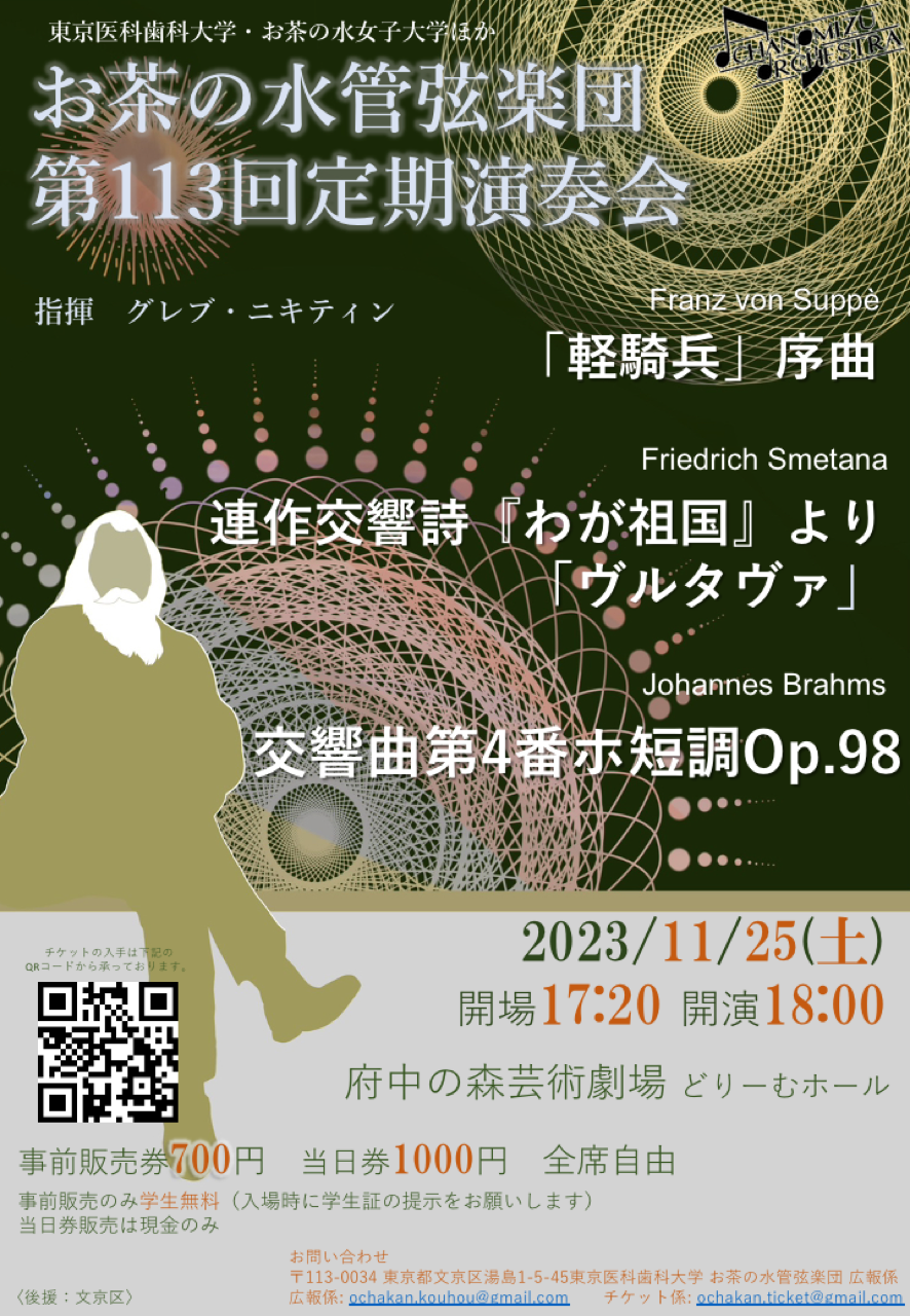 指揮者にグレブ・ニキティン氏を迎え、113回目となるお茶の水管弦楽団の定期演奏会。煌びやかなファンファーレ、繊細な表題音楽、情熱的なシンフォニー、と多彩なメロディーを奏でるヨーロピアンプログラムとなっております。皆さまお誘い合わせの上、是非ご来場ください。