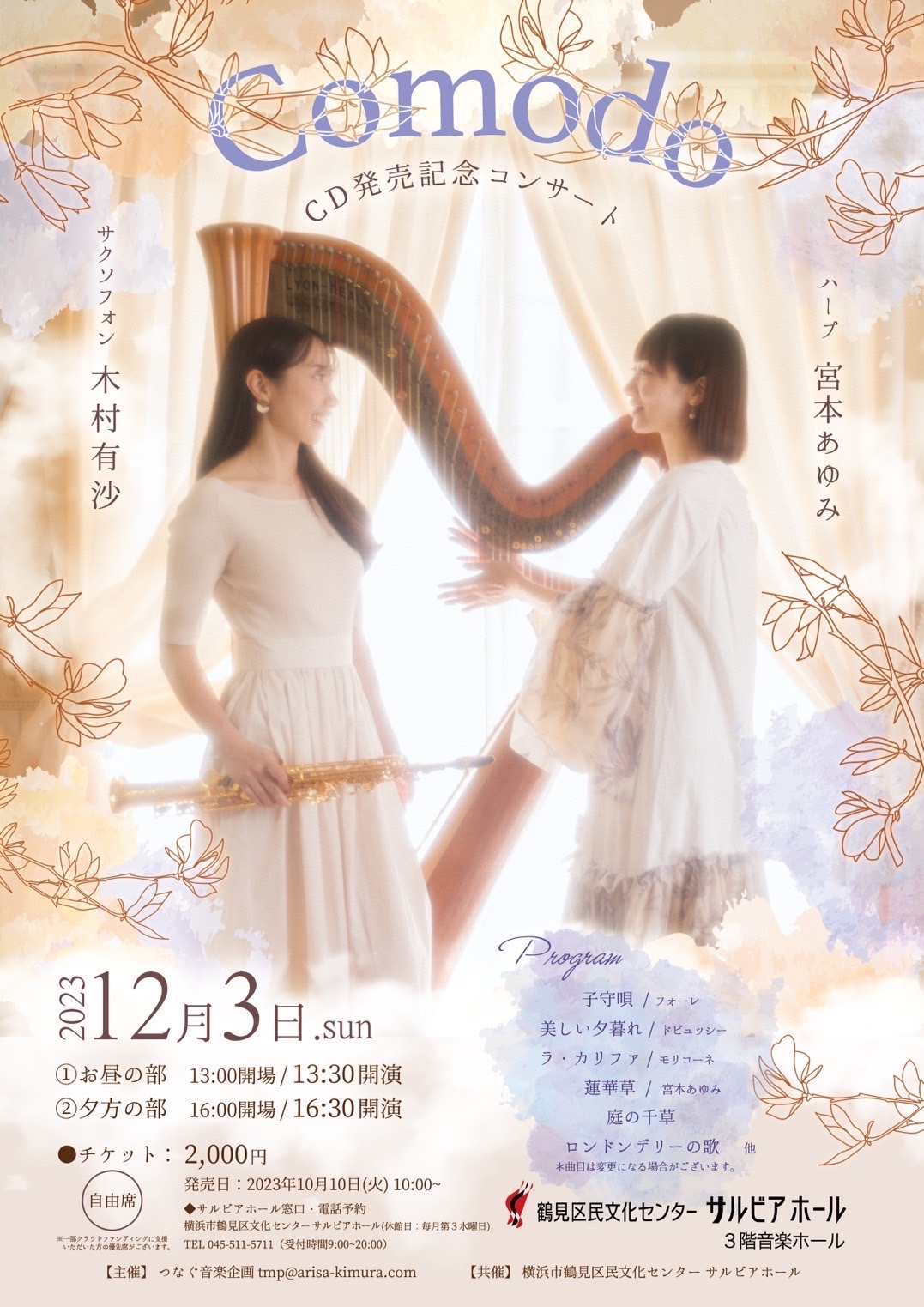 サクソフォニスト木村有沙とハーピスト宮本あゆみによる1st CD『Comodo』の発売記念コンサートです。CDに収録する曲を中心に演奏いたします。