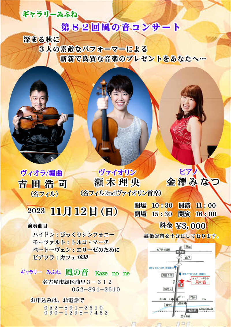 第82回となる「風の音コンサート」は名フィルの2人。2ndヴァイオリン首席/瀬木理央と 編曲/ヴィオラ吉田浩司 そして若手演奏家に人気のピアニスト/金澤みなつの3人による演奏で、一味違ったクラシックの曲の楽しさを味わって頂けると思います。