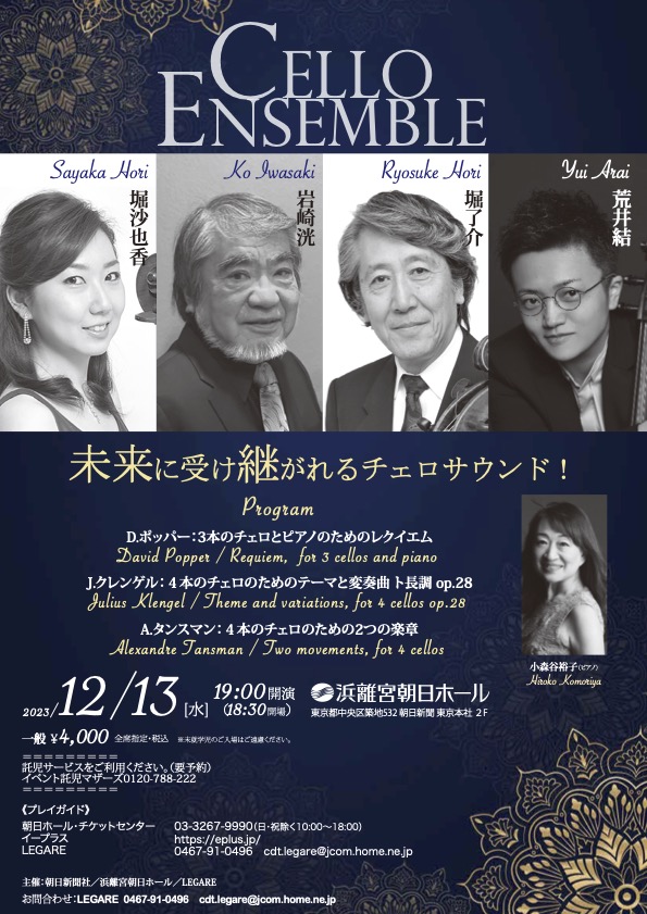 2人のレジェンド岩崎洸、堀了介と2人の若手堀沙也香、荒井結の4人のチェリストが色々な形のチェロアンサンブルを演奏する。 福井、名古屋、に続いての最終公演が東京の浜離宮ホールで開催。 ヴィヴァルディからポッパー、クレンゲルなどプログラムも楽しく美しい曲を選曲! お聞き逃しなく!