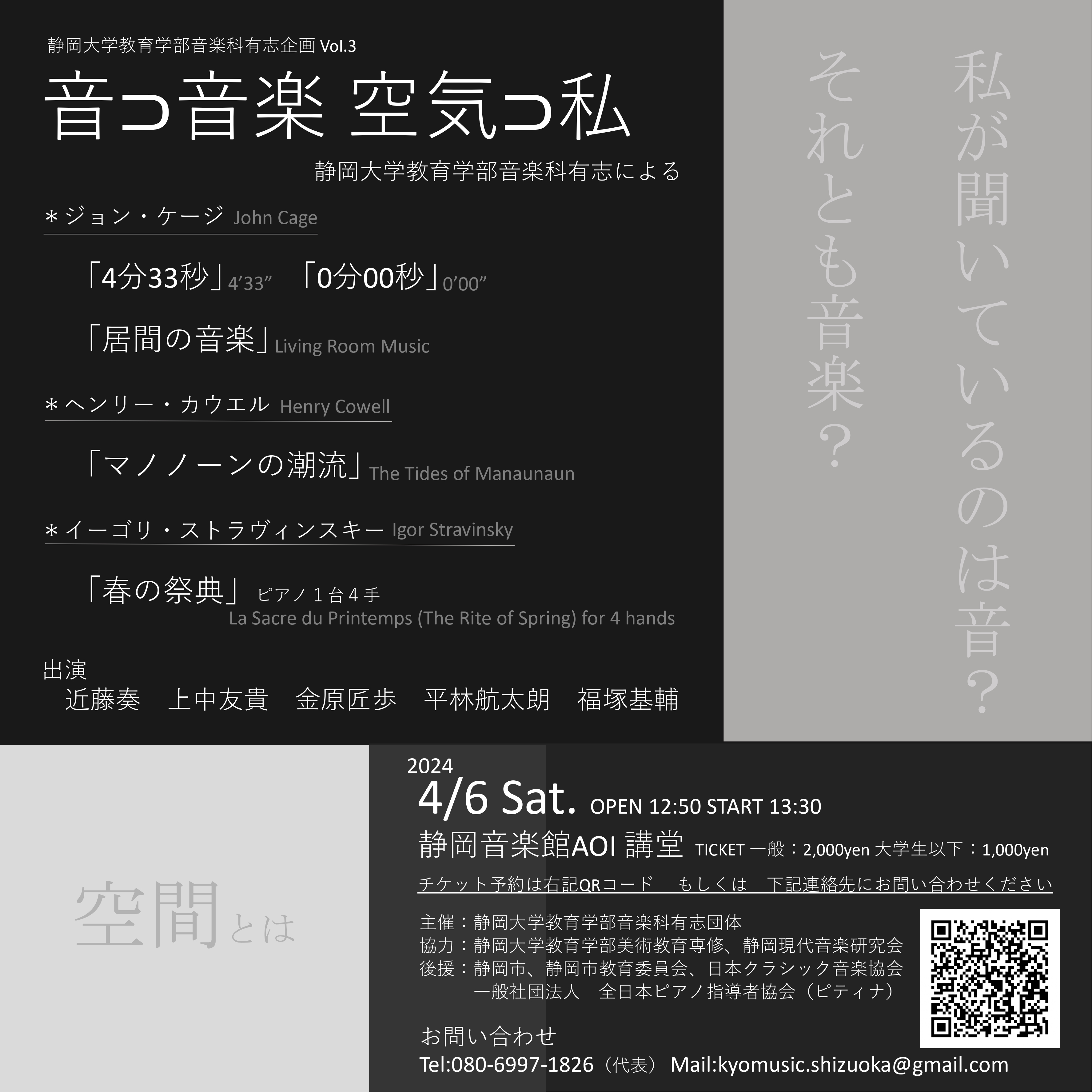 テーマは「空間」音楽によって醸し出される魅力的で不思議な空間。実は皆さんが今、過ごしている空間とそんなに変わらないのかも?そんな「空間」へのアプローチをすべくアメリカの前衛作曲家ジョンケージ、ヘンリーカウエル、そしてロシアの問題児、イーゴリ・ストラヴィンスキーの作品を取り上げます!