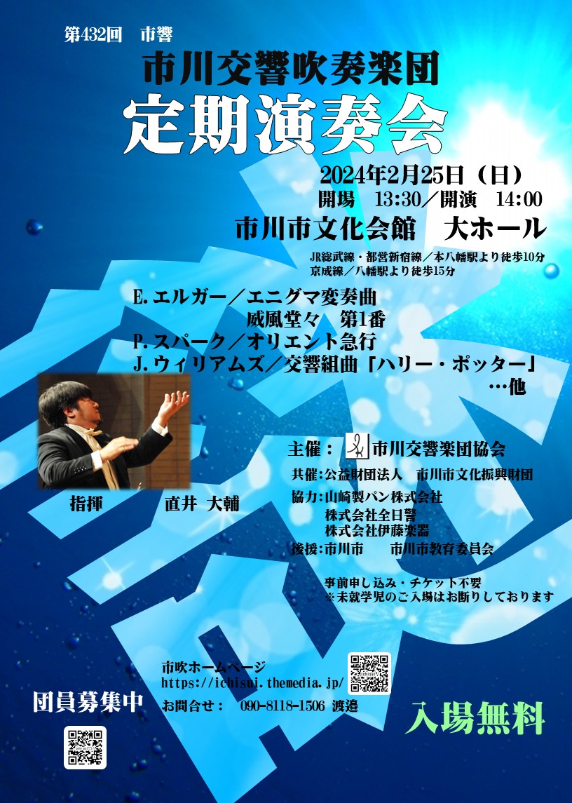 第432回 市響 市川交響吹奏楽団定期演奏会が本日25日14:00〜市川市文化会館で開催です