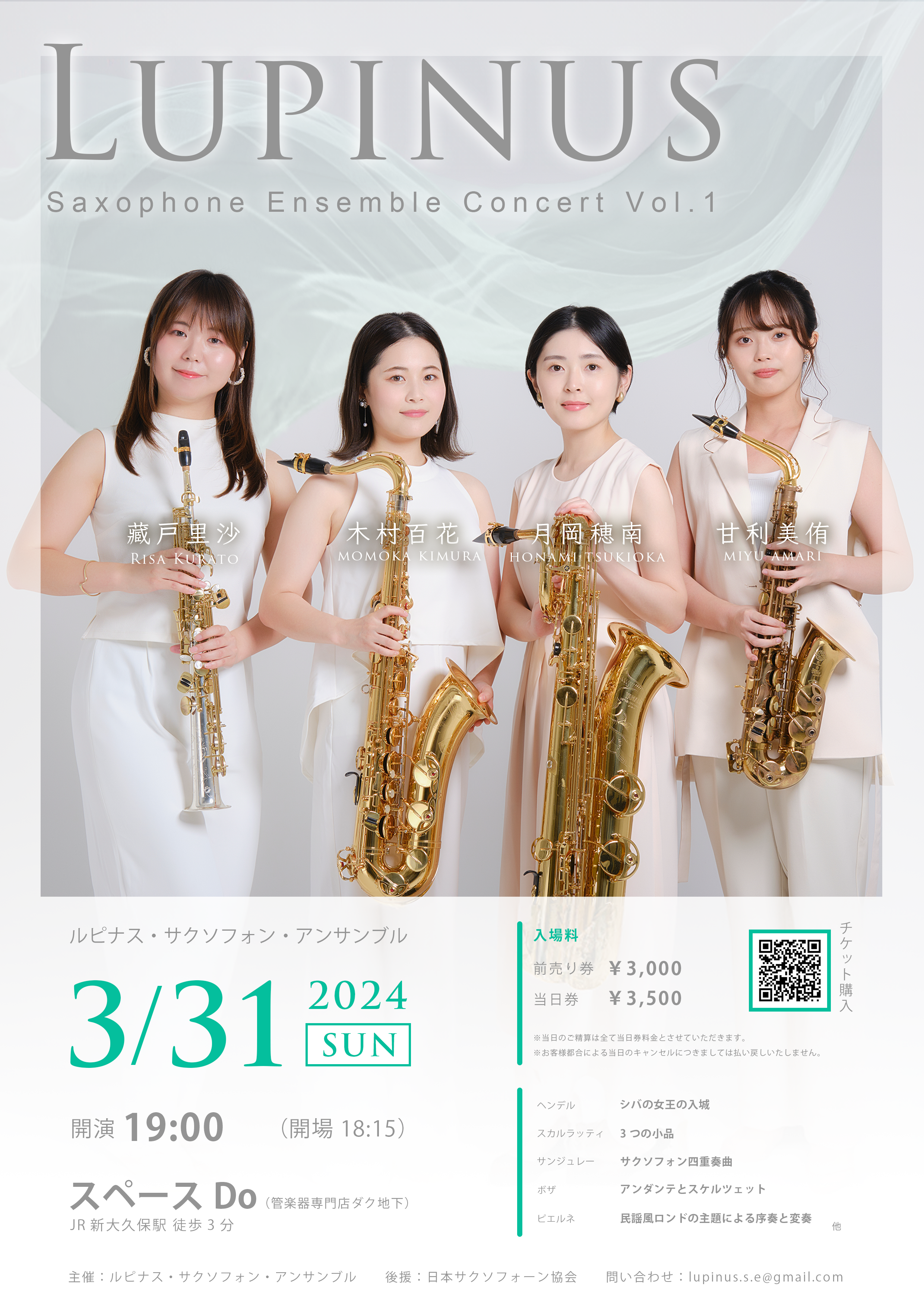 2022年に結成したルピナス・サクソフォン・アンサンブル。ナゴヤサクソフォンコンクール(2024)では第2位を受賞。クラシカルなプログラムで、華やかなルピナスの音楽をお楽しみください!