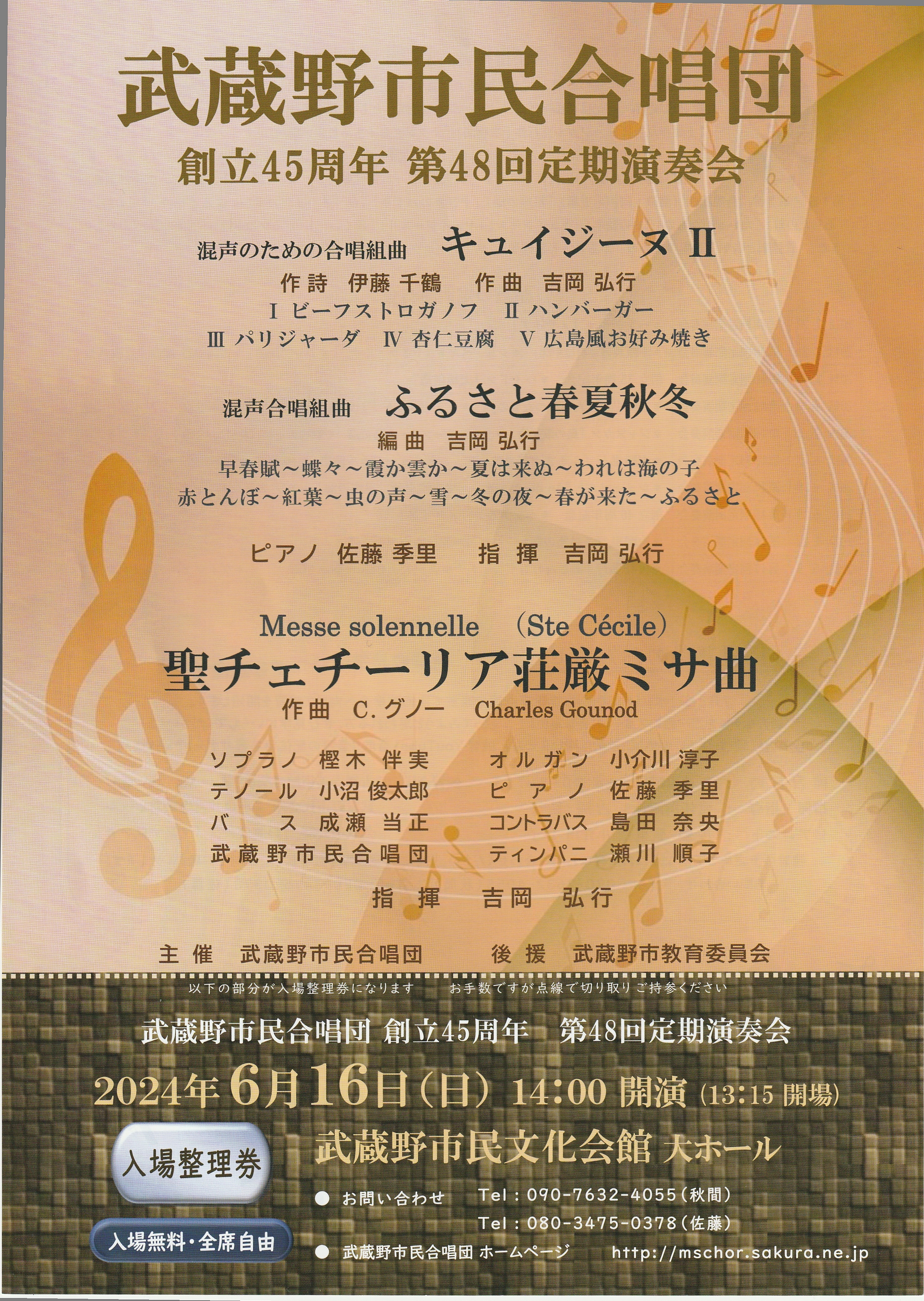 色々な料理のレシピを合唱曲に仕立てた楽しい曲集「キュイジーヌⅡ」、早春賦から始まり我は海の子・紅葉・ふるさと等と続く懐かしい日本の曲メドレー「ふるさと春夏秋冬」、荘厳で美しい「聖チェチーリア荘厳ミサ曲」と、盛沢山の演奏会です。