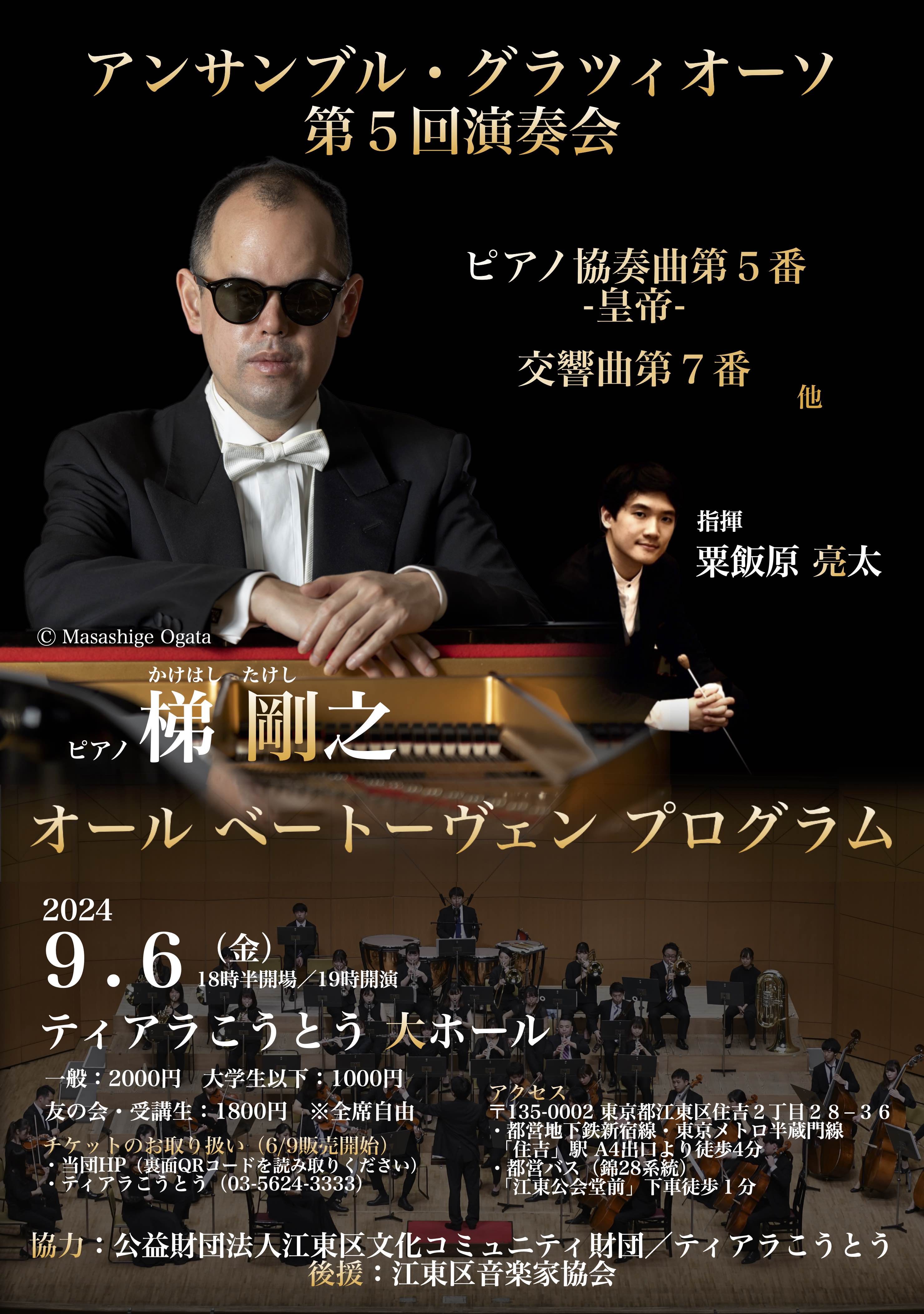 アンサンブル・グラツィオーソは、演奏能力の向上を目指し協奏曲を取り上げてきました。5年ぶりのオーケストラ公演では、梯剛之氏をソリストに迎え、ベートーヴェン作曲のピアノ協奏曲第5番「皇帝」をメインに、オールベートーヴェンプログラムをお届けします。