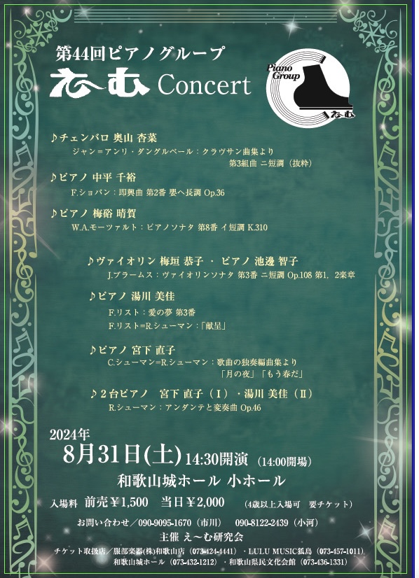第44回え〜むコンサートでは、出口美智子先生の門下生たちが素晴らしい演奏を披露します。伝統と革新が融合したプログラムで、ピアノの魅力を存分に堪能できるコンサートです。