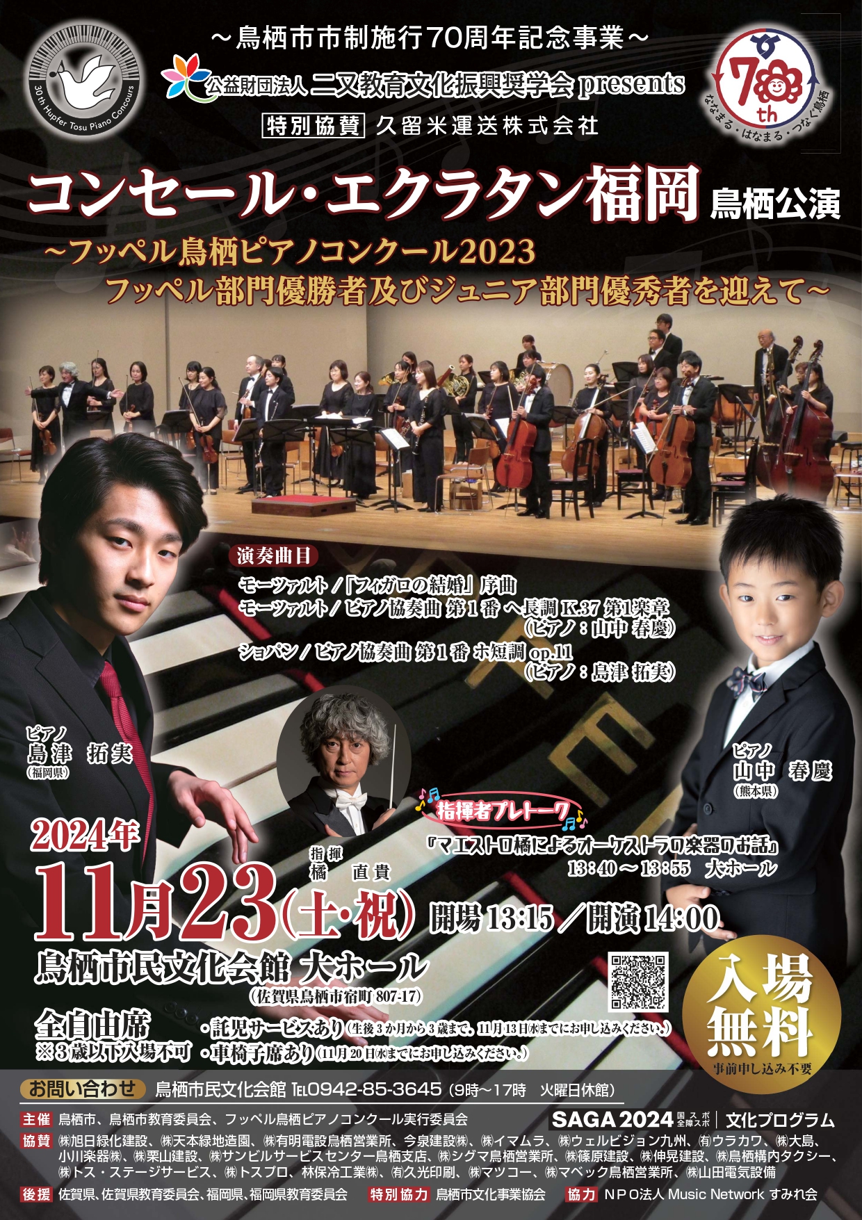 フッペル鳥栖ピアノコンクール2023 フッペル部門優勝者の島津 拓実さんとジュニア部門優秀者の山中 春慶さんをソリストに迎えて、「コンセール・エクラタン福岡」との共演を披露します。