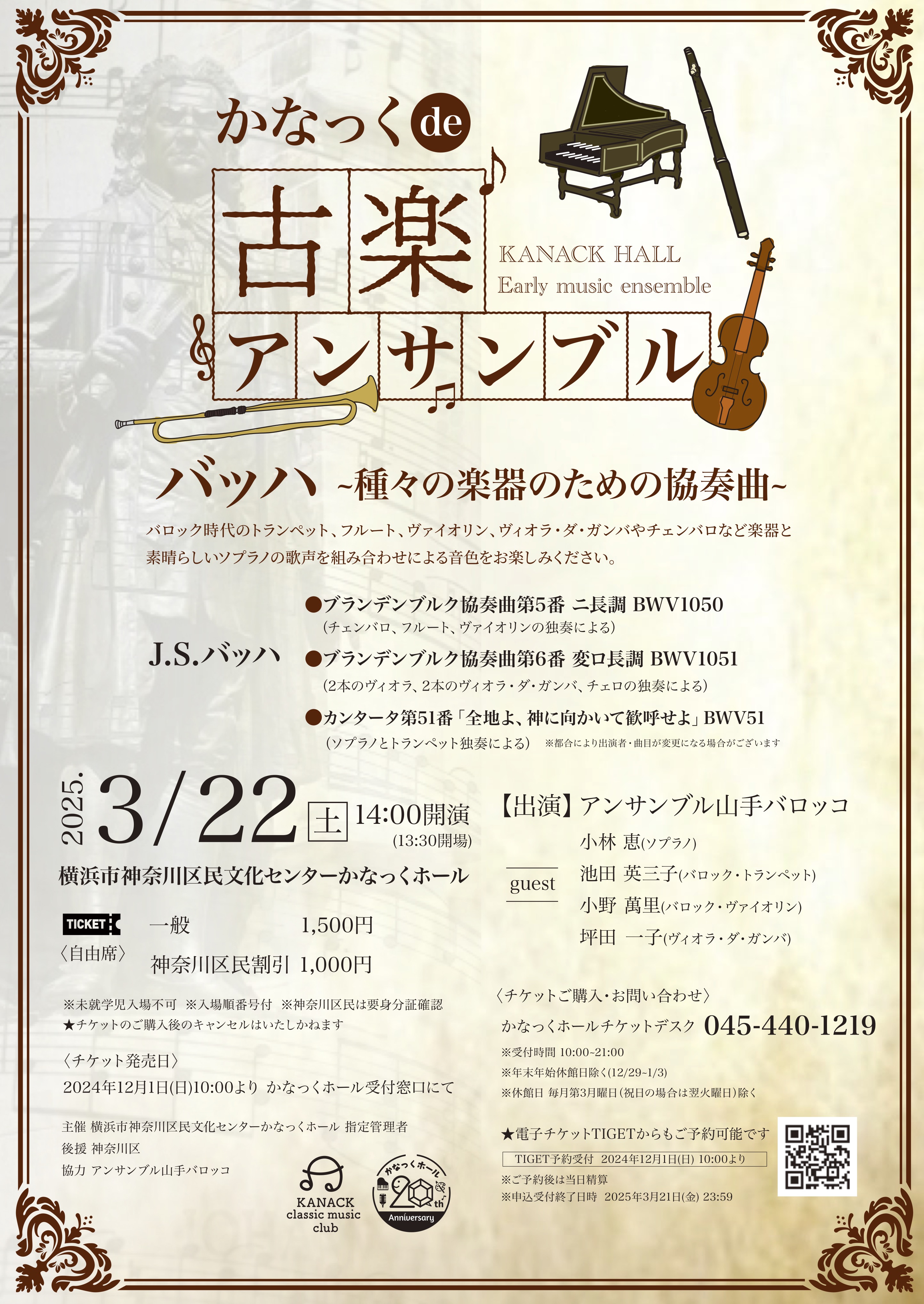 「かなっくde古楽アンサンブル」は、バロック時代に演奏されていた楽器(古楽器)を使って、当時の響きを再現します。バロック音楽の大作曲家、ヨハン・ゼバスチャン・バッハの作曲した2曲の協奏曲と声楽曲をお届けします。ブランデンブルク協奏曲として知られている協奏曲は、バッハは「種々の楽器のための協奏曲」と呼んでいます。第6番は、弦楽器のアンサンブルによる協楽曲で、腕で支えて演奏するヴィオラと足に挟んで演奏するヴィオラ(・ダ・ガンバ)とチェロが独奏を披露します。第5番は、チェンバロを独奏に、世界で初めて作曲された曲といわれており、フルートとヴァイオリンとともに独奏を披露します。バロック時代の楽器演奏は、人間の声(歌手)を目標に研鑽したといわれています。バッハのカンタータ「全地よ、神に向かいて歓呼せよ」はソプラノとトランペット、弦楽アンサンブルのための曲で、あふれる喜びを声と楽器のソロで歌い上げます。