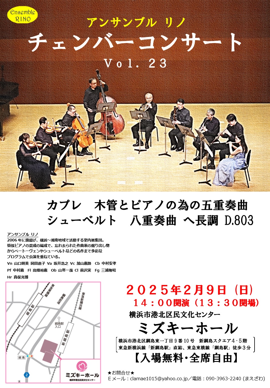 チェンバーコンサートVol.23では、シューベルトの名作「八重奏曲」を再演します。演奏時間60分を超えるこの大作は、アンサンブル リノの持つ豊富な演奏経験とメンバー個々の演奏スキルを生かし楽しいシューベルト空間を提供いたします。また、前プロではカプレの「五重奏曲」も取り上げます。ピアノと木管楽器の掛け合いやロマンチックなメロディーが聴きどころです。新たにオープンした港北区民文化センター「ミズキーホール」での演奏、メンバー一同も楽しみにしています。東急新横浜線の新綱島駅直結、東横線綱島駅から徒歩3分の大変便利な立地にあるホールに、ぜひご来聴くださいませ。
