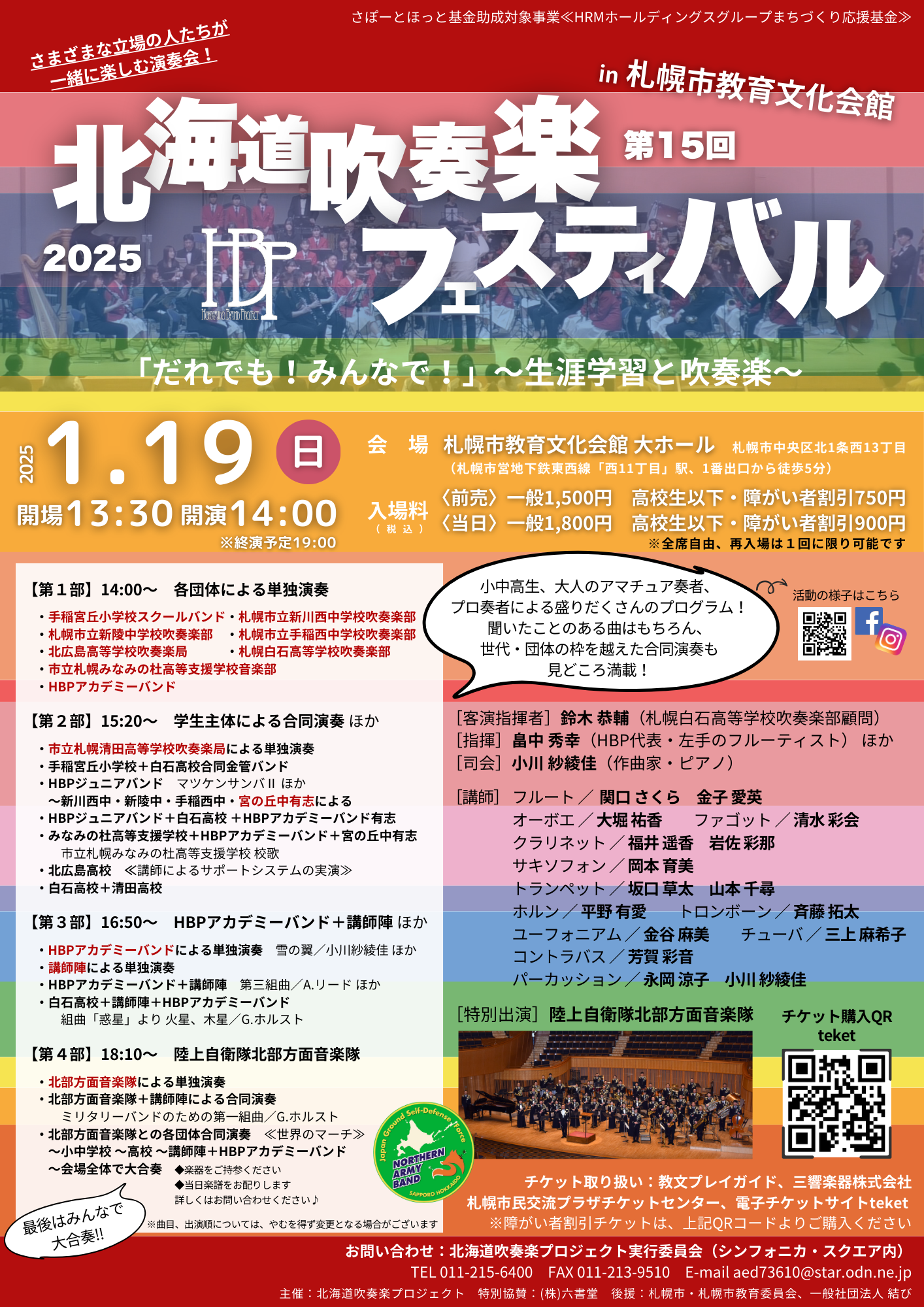 小学生から大人までの世代間交流、プロ奏者・アマチュア奏者の交流をテーマとしている当プロジェクトですが、今年度はさらに「陸上自衛隊北部方面音楽隊」の皆様にお越しいただき、より一層様々な立場の方々にお楽しみいただけるプログラムを準備しております。