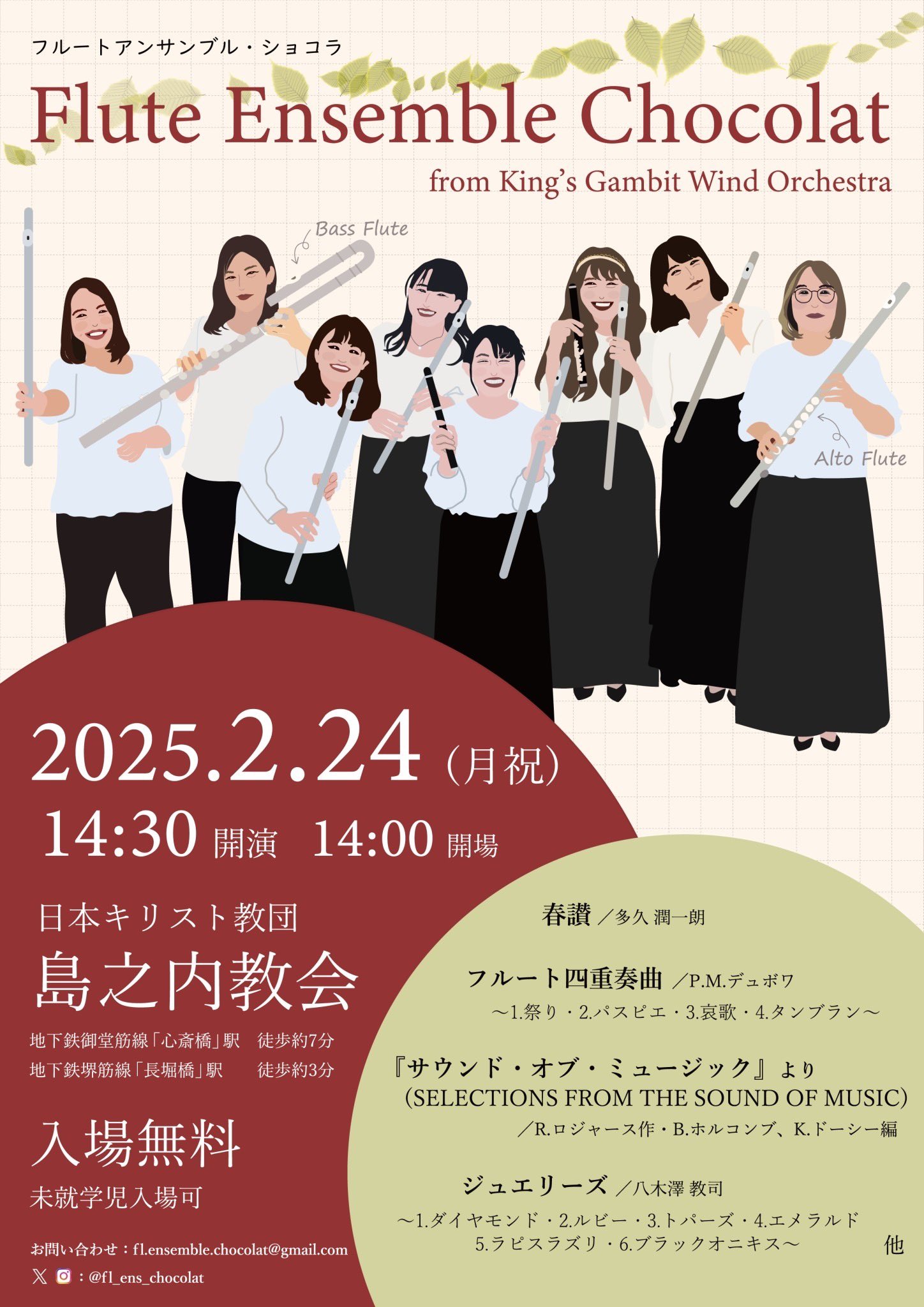 大阪北摂地域で活動する吹奏楽団、King’s Gambit Wind Orchestraで出会ったフルート吹き達で結成されたアンサンブル団体です🪈団体名には、チョコのように甘い表現もビターな表現も出来るように…という願いを込めています💫