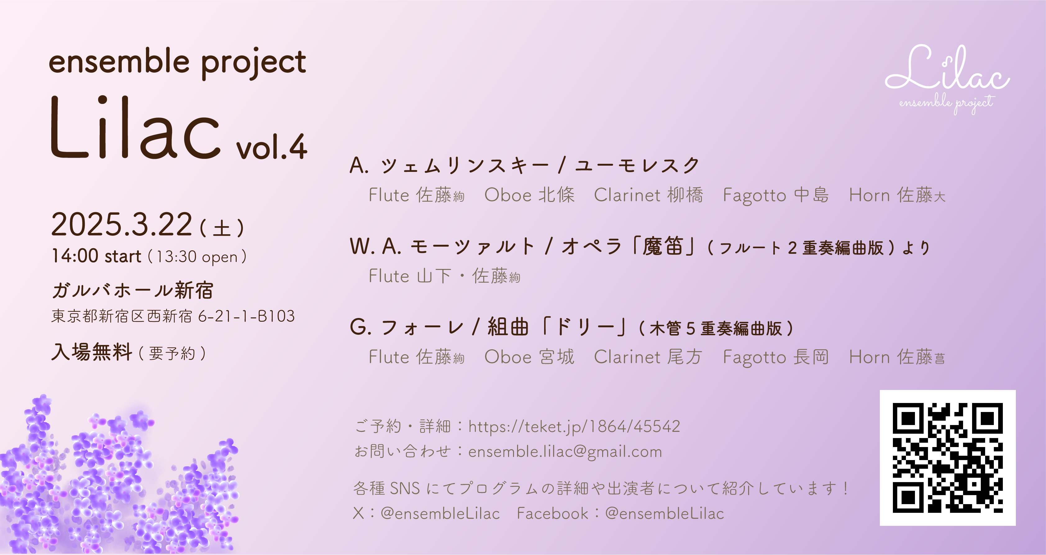 ensemble project Lilac vol.4で、アレクサンダー・ツェムリンスキーの『ユーモレスク』、ヴォルフガング・アマデウス・モーツァルトのオペラ『魔笛』のフルート2重奏編曲版、そしてガブリエル・フォーレの組曲『ドリー』の木管5重奏編曲版を演奏します。各楽器の奏者が集まり、緻密に構成された魅力的な室内楽プログラムをお楽しみください。