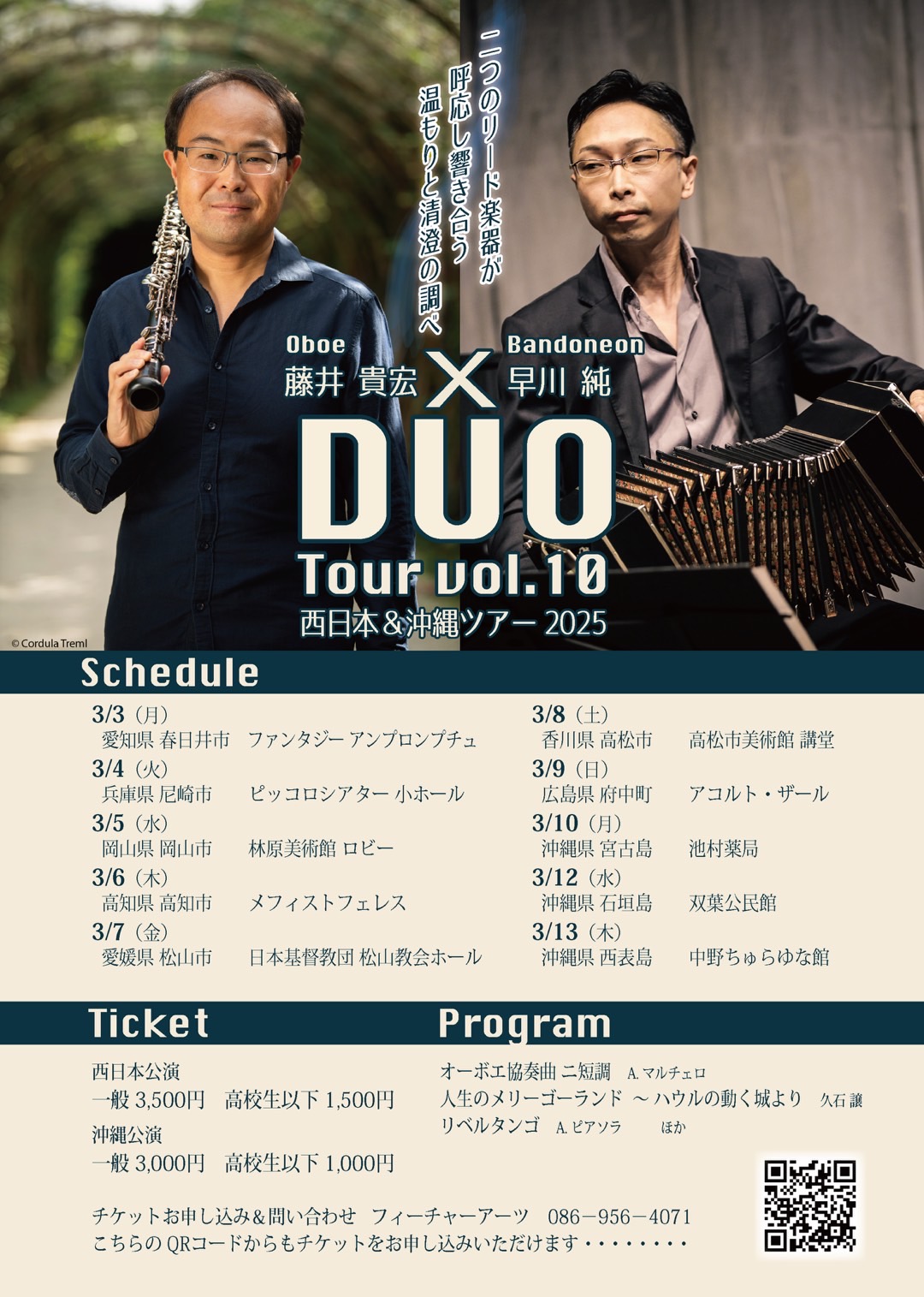 大学で同期だった、ドイツを拠点に活躍するオーボエ奏者:藤井貴宏、フランスで研鑽を積み日本各地で活躍するバンドネオン奏者:早川純が組み2022年秋からスタートした企画。これまで国内外60箇所以上で演奏会を行い、同じリード楽器から生まれる唯一無二のサウンドとオリジナリティあふれる編曲をトークと共に大好評を得ている演奏会です。クラシックは勿論、映画音楽、ジブリ作品、そしてタンゴまで、演奏会が初めてという方から玄人の方まで楽しめる内容です。是非お越しください!