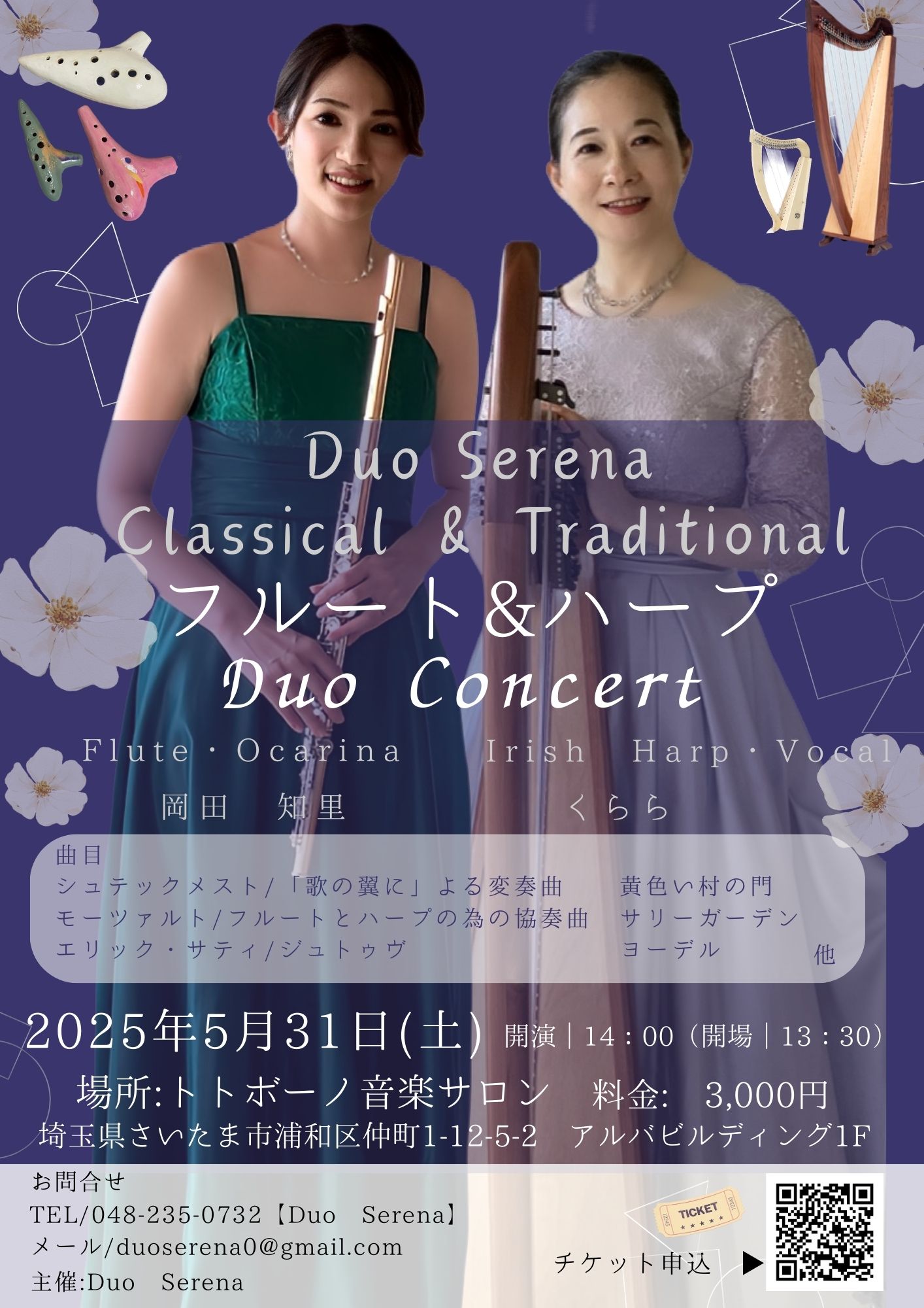 フルート・オカリナ・アイリッシュハープ・歌など様々な音色でのクラシックとトラディショナルなプログラムをお楽しみください。
