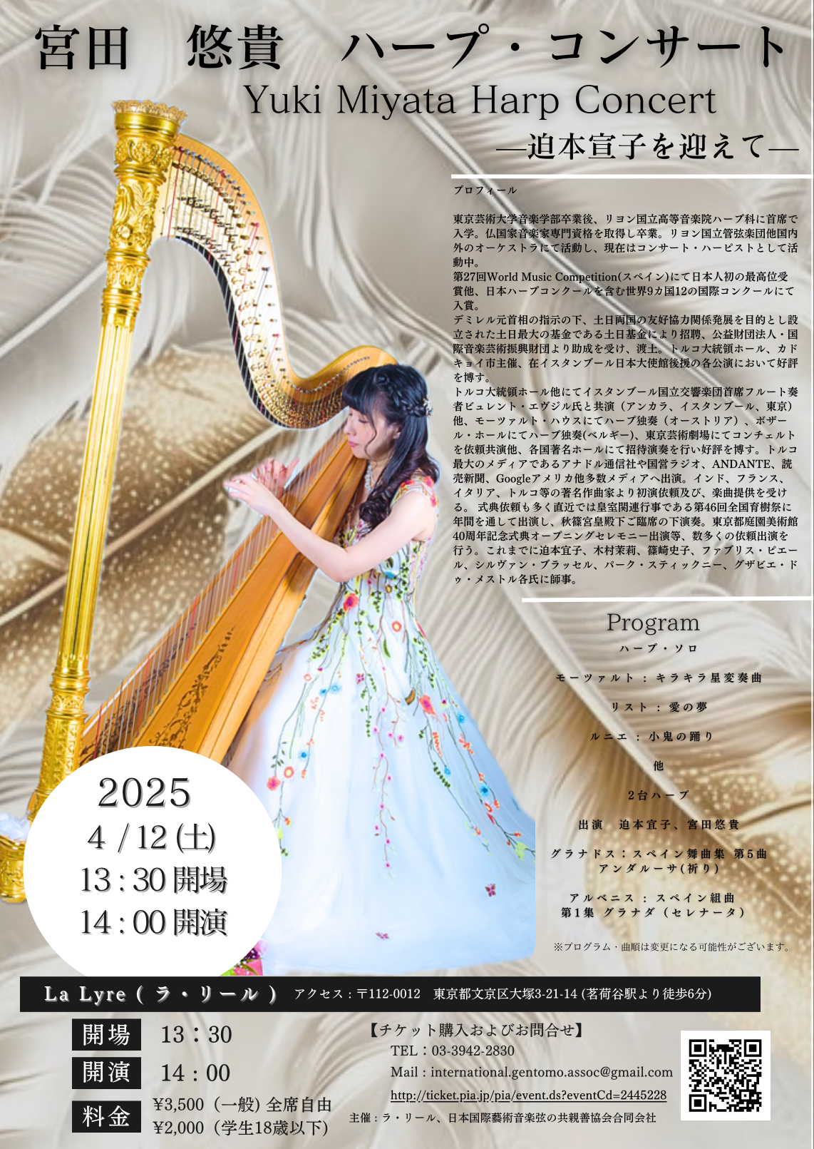 ハープソロによる愛をテーマとした名曲プログラム、及びハープデュオによる華やかなスペイン舞曲を軸としたプログラムを是非お楽しみいただけましたら幸いです。