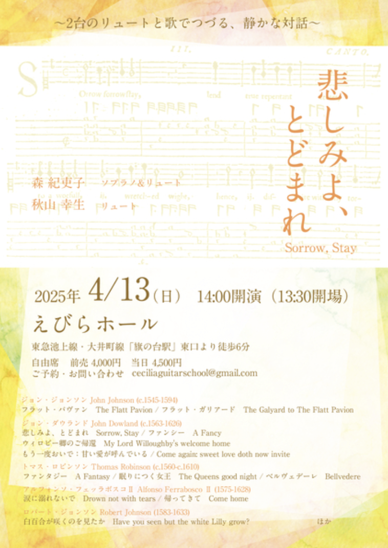 リュートは中世、ルネサンス、バロックを通してヨーロッパに広く行き渡り、愛奏されました。本公演ではシェイクスピアの時代に(1600年頃)、イギリスで親しまれたリュートソングやリュートのデュオ、ソロなどをお届けします。昔々の遠い地で育まれた音楽。でも不思議とそれらに儚さや哀しさといったノスタルジーを感じることでしょう。