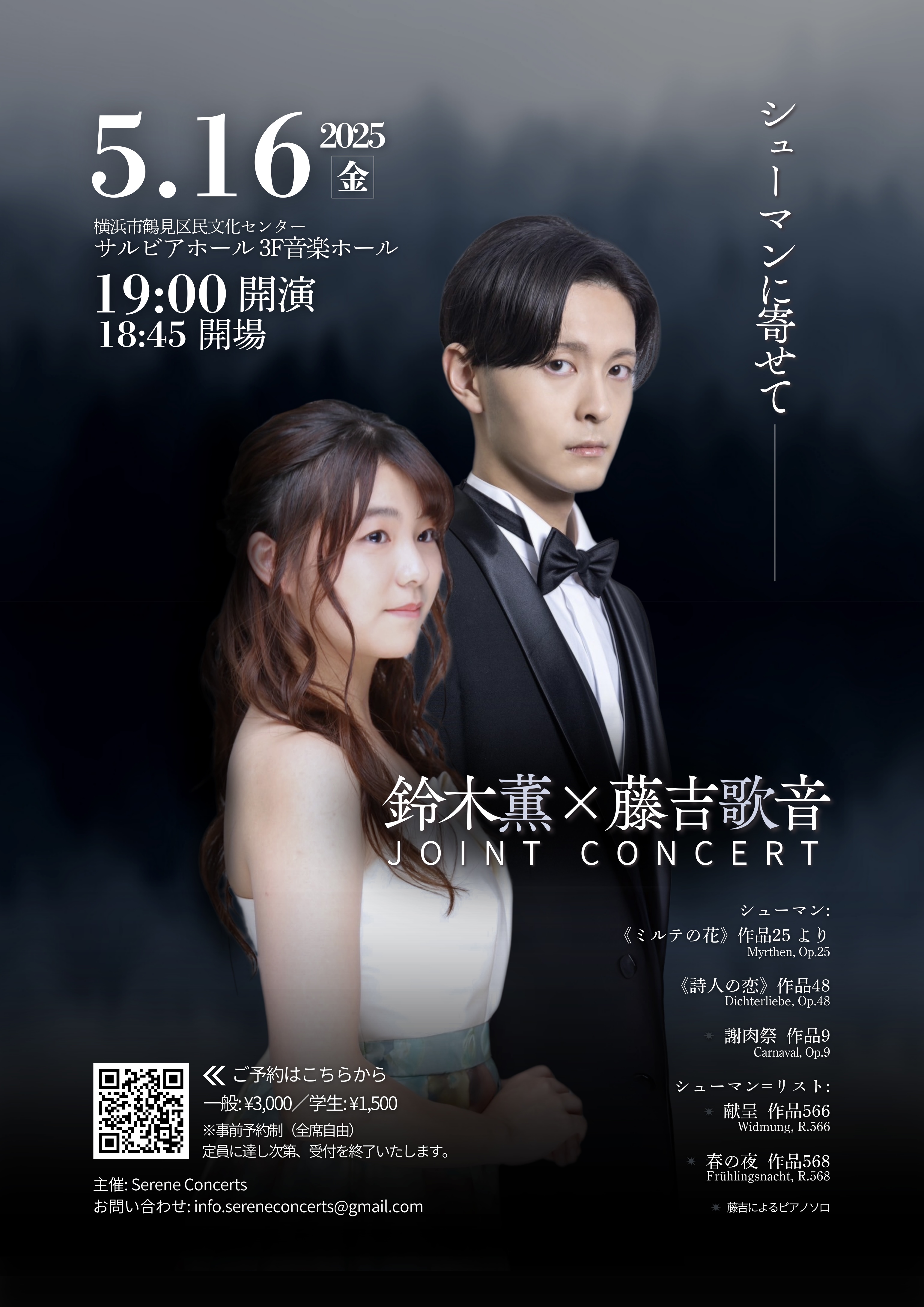 バリトン鈴木薫とピアノ藤吉歌音によるオールシューマンプログラム(リストによるピアノ独奏編曲を含む)をお届けいたします。