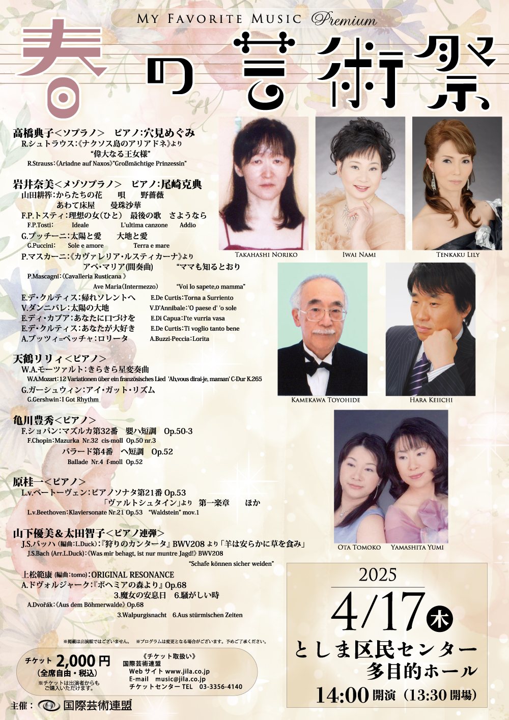 声楽とピアノが織りなす至福の時を味わえる、春の芸術祭。R.シュトラウスや山田耕筰、モーツァルトなど世界的な作曲家の名曲が披露されます。ソプラノ・メゾソプラノの輝かしい歌声やピアノの調べを楽しむことができる、多彩なプログラムとなっており、クラシックを深く愛する方も初心者も引き込まれる内容です。
