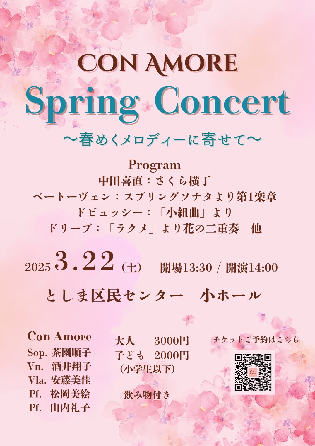 昨年、おかげ様5周年を迎えたCon Amore🌹(ヴァイオリン、ヴィオラの、声楽、ピアノ2台によるアンサンブル)初の、春のコンサートです😊