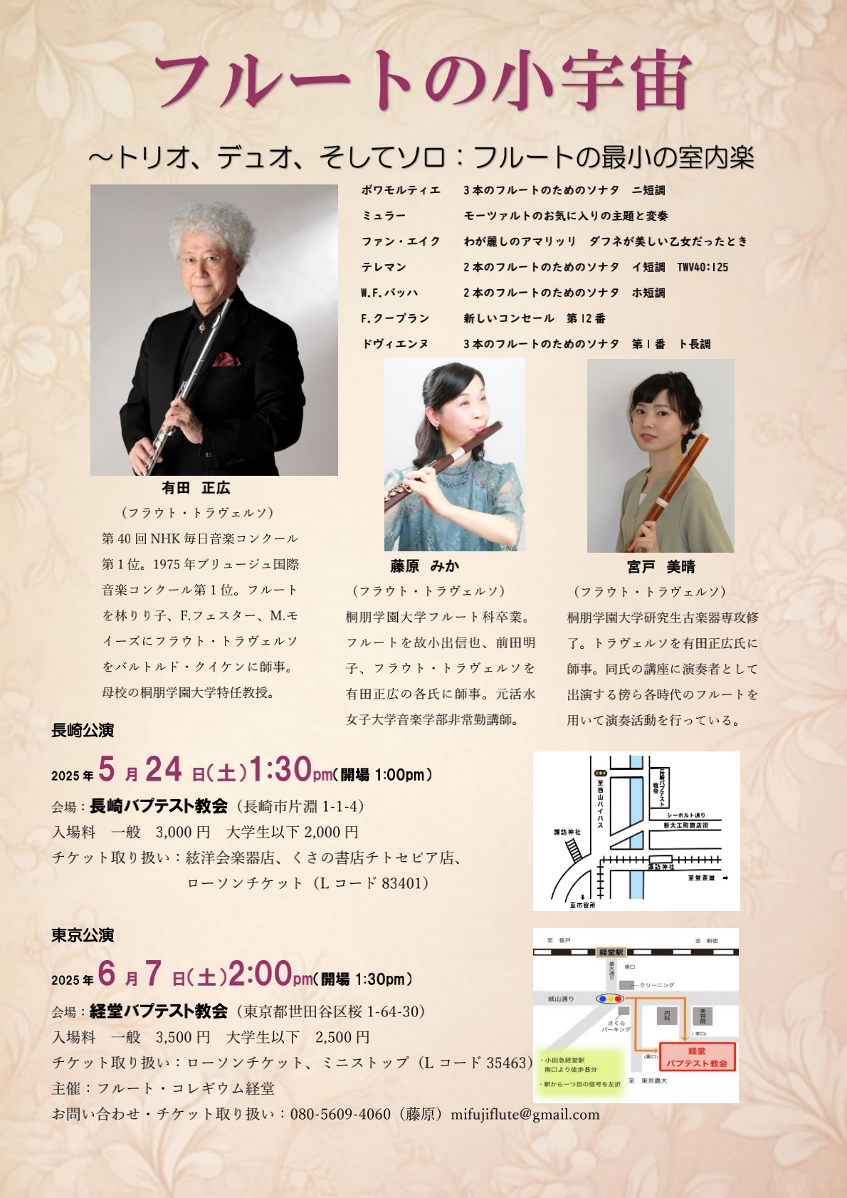 日本の古楽界の草分け、有田正広氏と、その弟子、宮戸美晴氏、藤原みか氏の3人よるフラウト・トラヴェルソの柔らかな響きを、小さな教会で聴く。